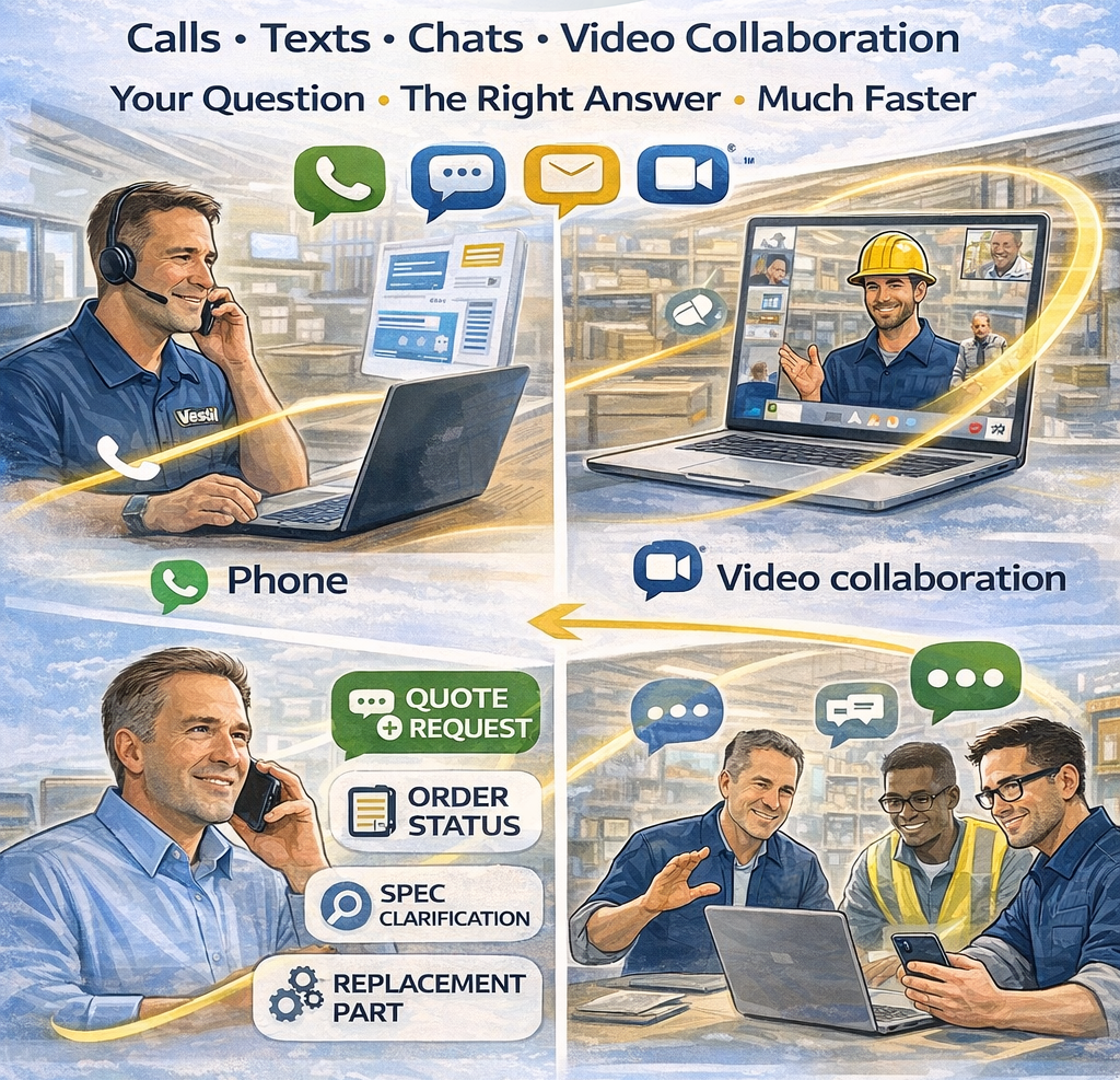 Because Vestil Connect is designed to shorten the path between your question and the right answer. Instead of waiting through multiple emails or repeated callbacks, customers can use a more responsive communication path that supports phone, text, collaboration, and faster internal routing.