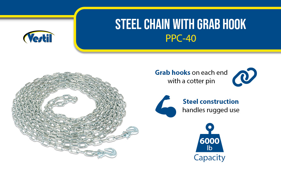 PPC-40 PPC-40Steel Chain with Grab Hook 40 Ft. Length 1/4 In. Chain 6,000 Lb. Pulling Capacity SilverUniform Pulling Capacity (lb.): 6000