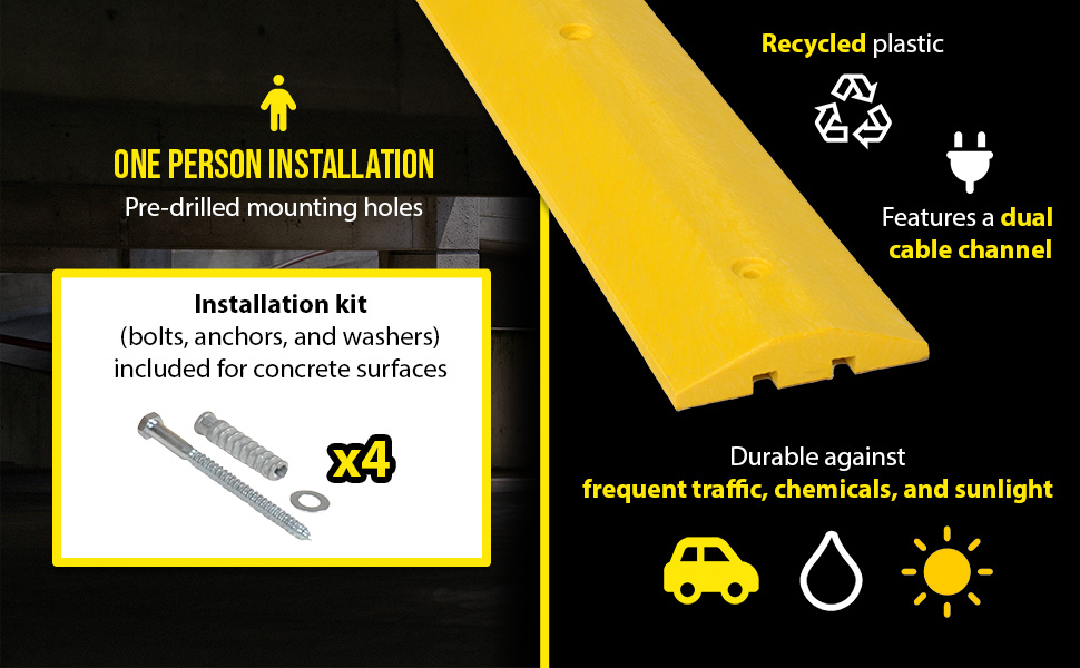 SB-48Help control drivers in dangerous, areas while protecting people and property. One person installation. Can be removed for seal coating, snow removal, or change of location. Resists marring by oil, road salt, sunlight, and chemicals. Feature dual 1"W x 3/4"H cable channels and includes hardware. Constructed of lightweight 100% recycled Low Density Polyethylene (LDPE). Compression strength is 3,200 pounds per square inch. The concrete hardware kit includes bolts, anchors, and washers. Asphalt kit includes spikes and butyl tape. The HD asphalt kit includes anchors and bolts. The HD anchor should be epoxied (epoxy not included) into the ground and then the speed bump is secured to that anchor with a bolt. The glue down anchor plate kit includes anchor plates, T-nuts, bolts, and washers. Requires 2-3 ounces of either 2-part epoxy or heavy duty construction adhesive to the bottom of each anchor plate, which is not included.
