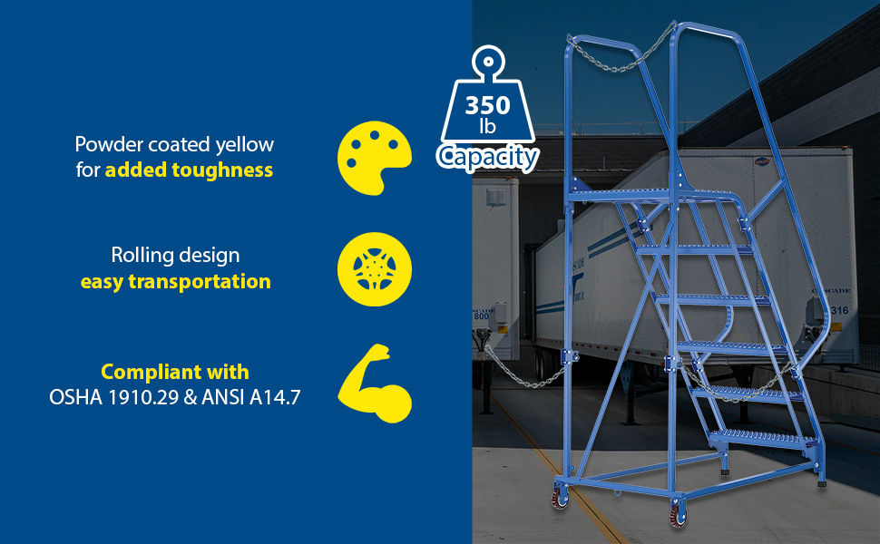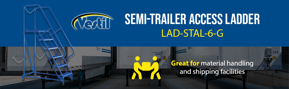 Semi-Trailer Access Ladders are for use getting into Semi-Trailers. Tilt the unit to allow for portability. Units roll on 4" poly-on-poly wheels. Constructed of square tubing framework which handles uniform capacities up to 350 lbs. Features 30" high removable hand railing, access chain, 21" deep top platform, and an industrial baked-in blue powder coat finish for toughness. Each step measures 24" wide by 7" deep and is spaced 10" apart. Climb Angle is 58 degrees. |