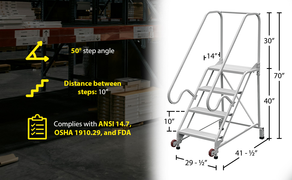 LAD-TRN-50-4-FDA LAD-TRN-50-4-FDASteel Tip N Roll FDA Compliant Ladder 50 Degree 4 Grip Strut 24 In. Step Width 350 Lb. Capacity WhiteUniform Capacity (lb.): 350