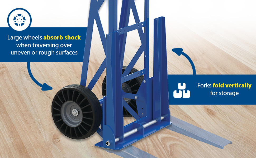 A standard hand truck isn't enough? Time to upgrade to a hand truck with forks. Forks allow the user to gather and maneuver large items that wouldn't fit securely on a standard hand truck. The forks are adjustable for a more precise fit, depending on the size of the product being transported. When not in use, the forks fold vertically into the body of the unit for more compact storage. Large wheels absorb shock when traversing over uneven or rough surfaces. Powder coated finish for added toughness.