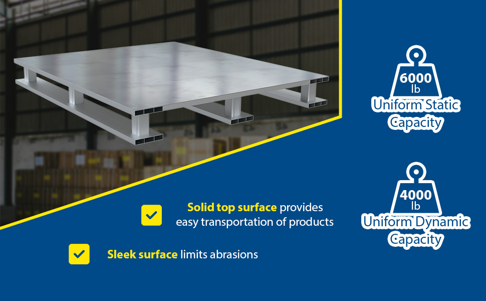 | Aluminum Solid Top with Skid Bottom 40 In. x 48 In. 6000 Lb. Capacity Silver | Static Capacity (lb.): 6,000 Dynamic Capacity (lb.): 4,000 | 113 |
