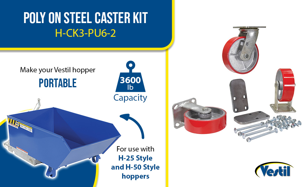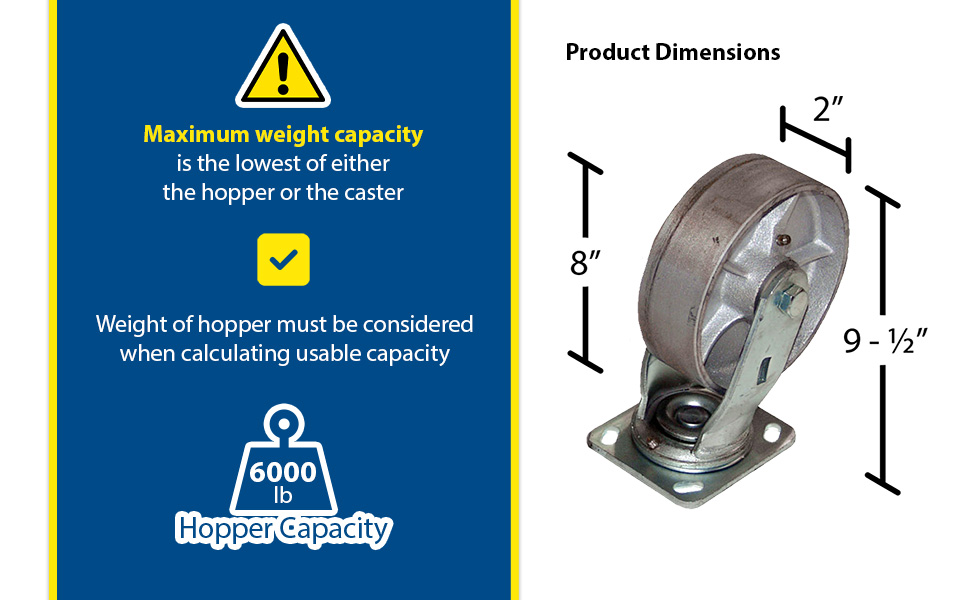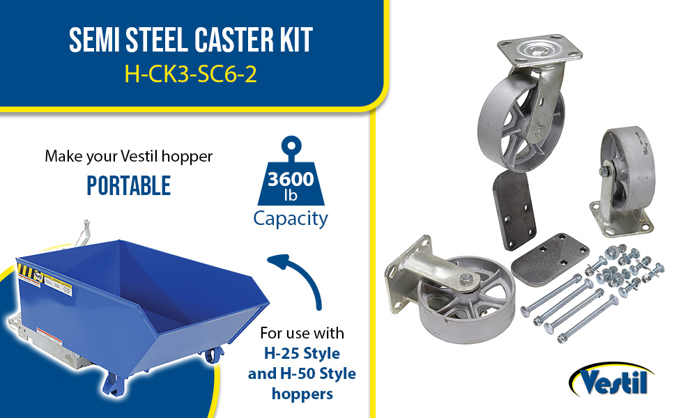 Transport loads with portable hoppers. The maximum weight capacity is the lowest weight capacity of either the hopper or the caster. Weight of hopper must be considered when calculating usable capacity. Sets include two (2) rigid, two (2) swivel casters. For the H series 1/4 and 1/2 cubic yard hoppers only three (3) casters are included, two (2) rigid and one (1) swivel, in addition to bolt on stabilizing legs for the back. Casters are bolted-on by utilizing the factory stamped hole in the fork tubes. Casters are shipped uninstalled to prevent freight damage.