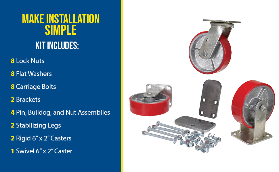 H-CK4-PU6-2 H-CK4-PU6-2Poly On Steel Caster Kit 6 In. x 2 In. 4,800 Lb. Capacity RedUniform Capacity (lb.): 4,800