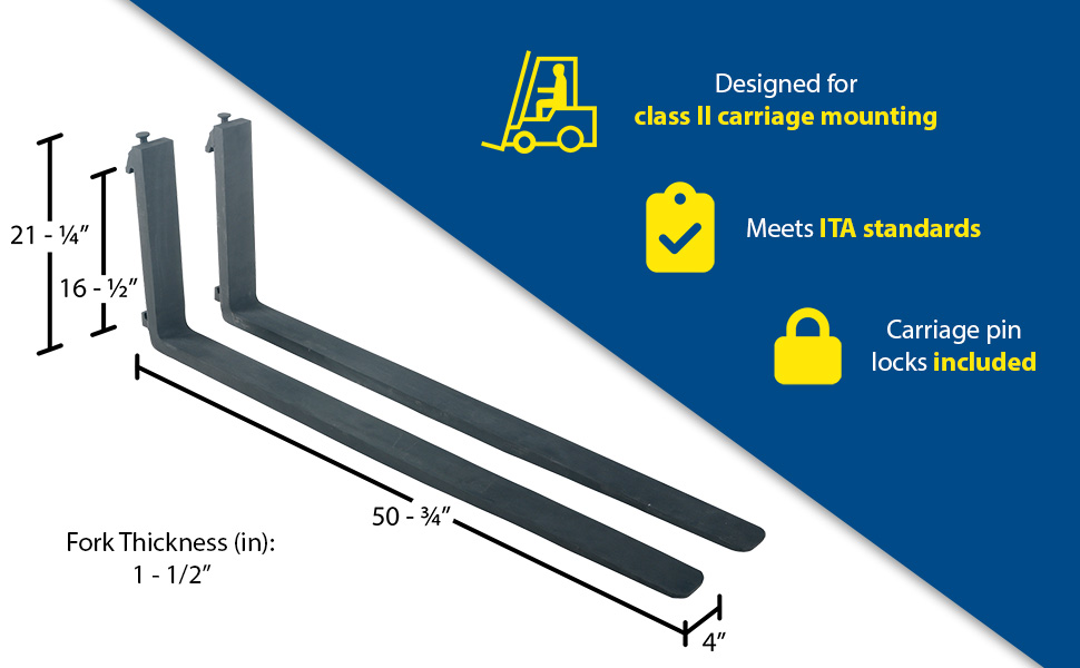 Change your current fork length or buy an extra pair of forks for an emergency with our new Forged Steel Forks. Forks are 4" wide each. Designed for class II carriage mounting. Meets I.T.A. standards.