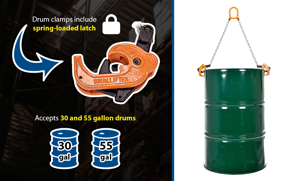 Designed for easy drum lifting and transporting operations with an overhead lifting device. Constructed of grade 80 chain for OSHA & ANSI compliance. Easy to use design. Drum clamps include spring-loaded latch for positive drum grip. For use with closed head steel and plastic 30 and 55 gallon drums with a top lip.
