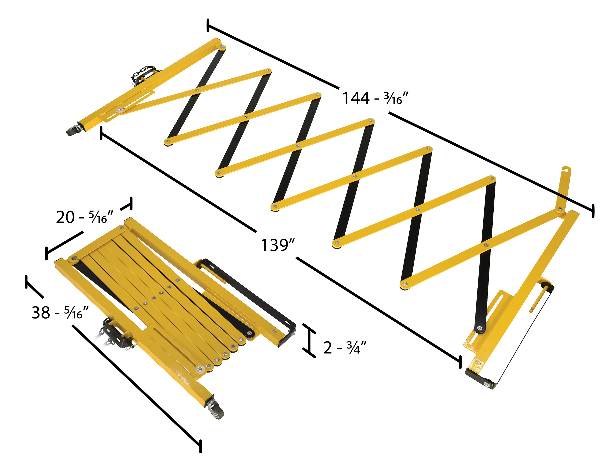 Overall Expanded Width (in.): 144-3/16 Expanded Gate Width (in.): 139 X-Bar section, Yellow Bars Gauge: 4