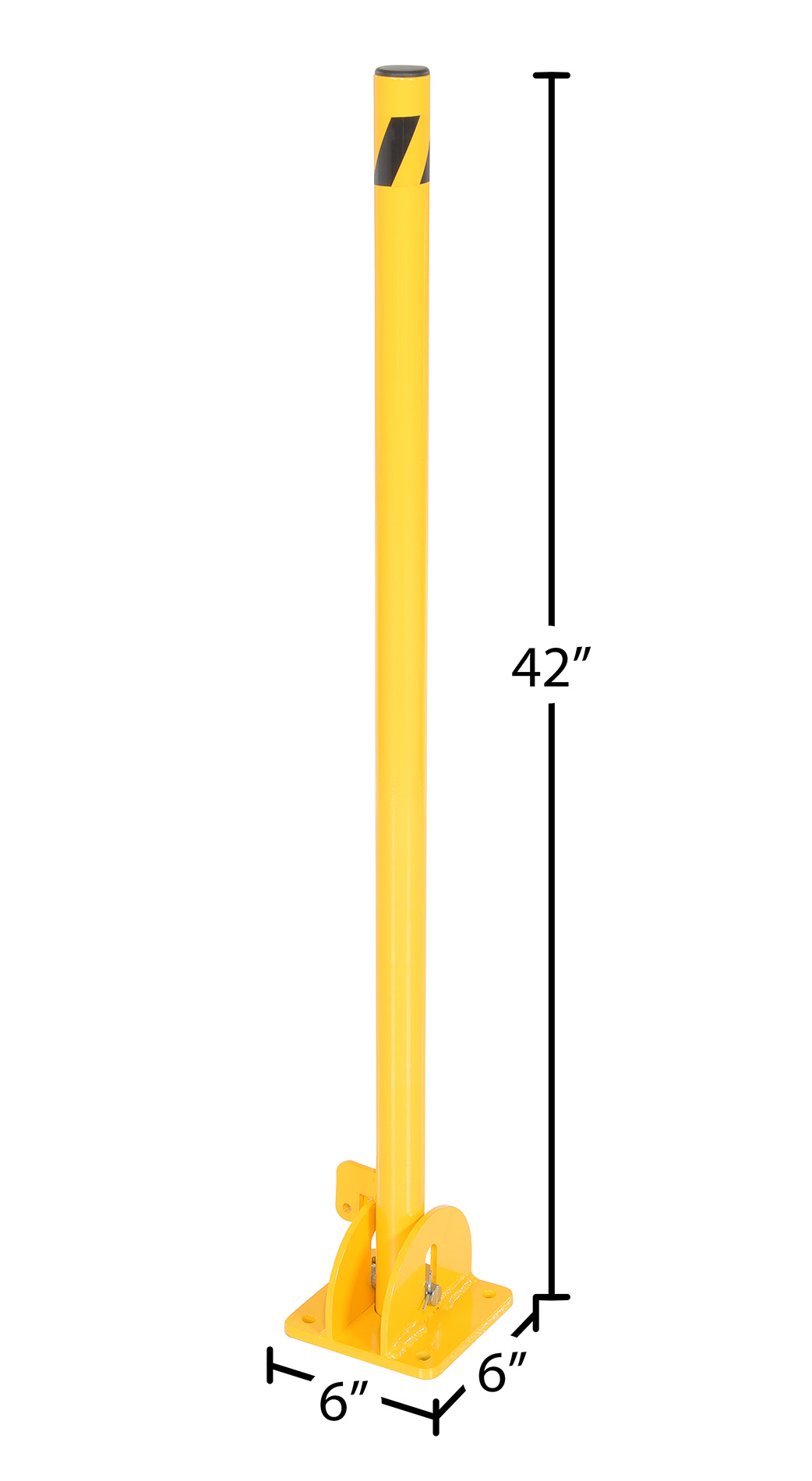 Steel Fold-Down Galvanized Bollard 42 In. YellowFolding steel barrier post for parking control and security. This folding bollard is locked in the raised position with a padlock (padlock not included). When padlock is removed, bollard may be lowered to ground to allow for access. Base plate must be lagged to ground for proper installation (installation hardware not included). Steel construction.
