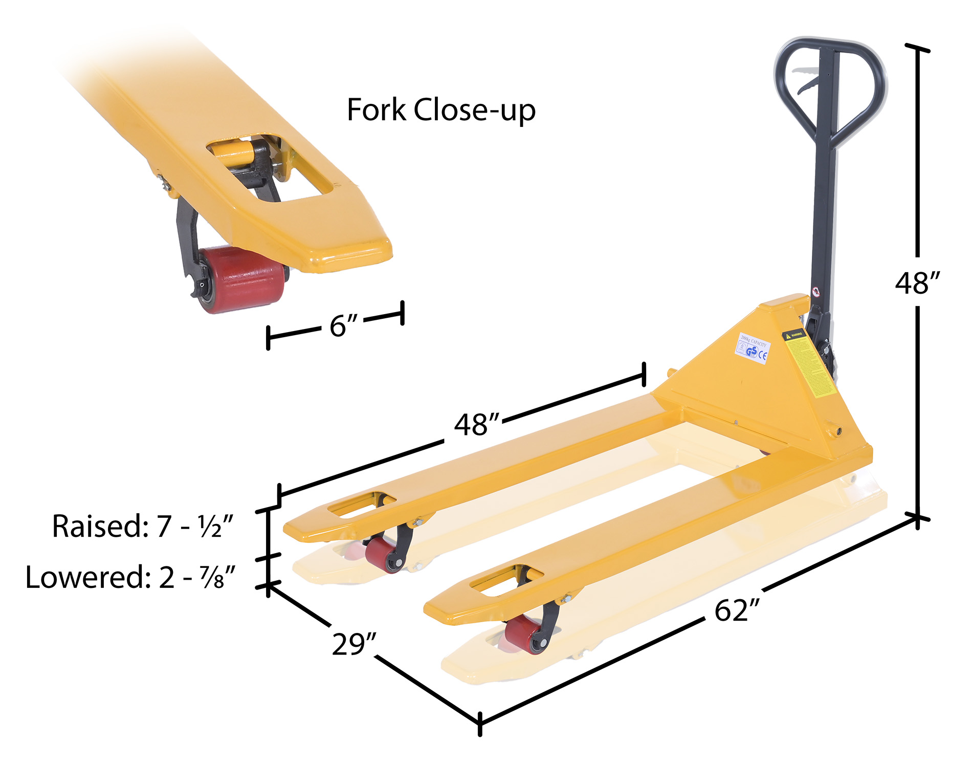 Raised Fork Height (In.): 7-1/2" Fork Size (In"): 27"W x 48"L Individual Fork Width (In.): 6