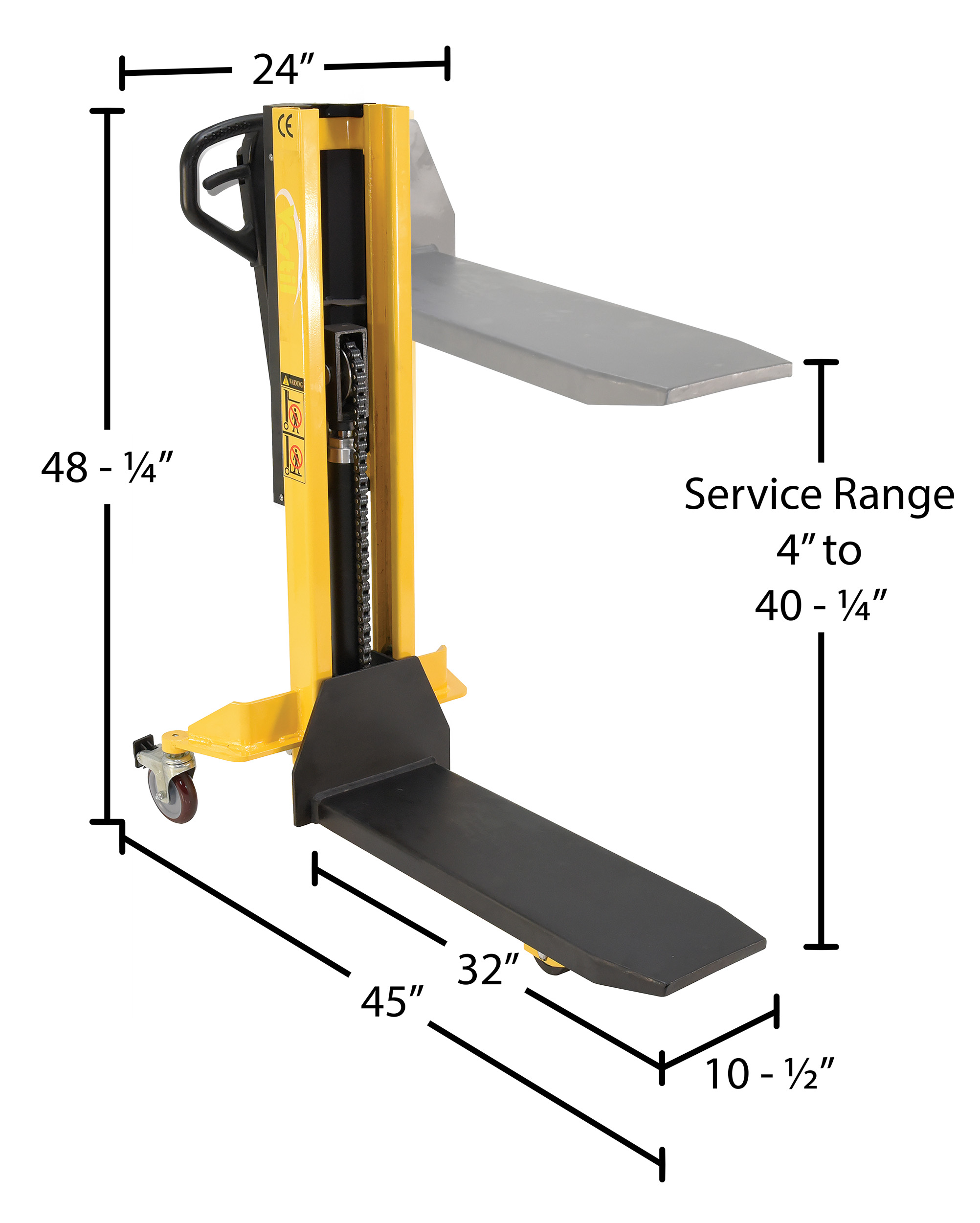 | Uniform Capacity (lb.): 600 | Service Range (in.): 4 to 40-1/4 | Fork Width/Length (in.): 10-1/2 x 32 |