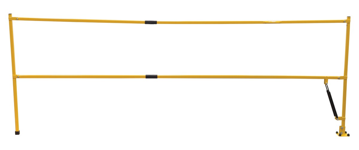 The Safety Lift Gate can be lifted out of the way with a single finger. Simply lift and the self folding action folds the gate in a vertical position. With the gas strut cylinder, the gate can be lifted with the slightest of effort. The Lift Gate is manufactured of steel tubing with a yellow baked-in powder-coat finish for added toughness. The unique design can be either wall or floor mounted. The Lift Gate is fantastic for mounting on loading dock doors to help reduce the possibility of people falling.