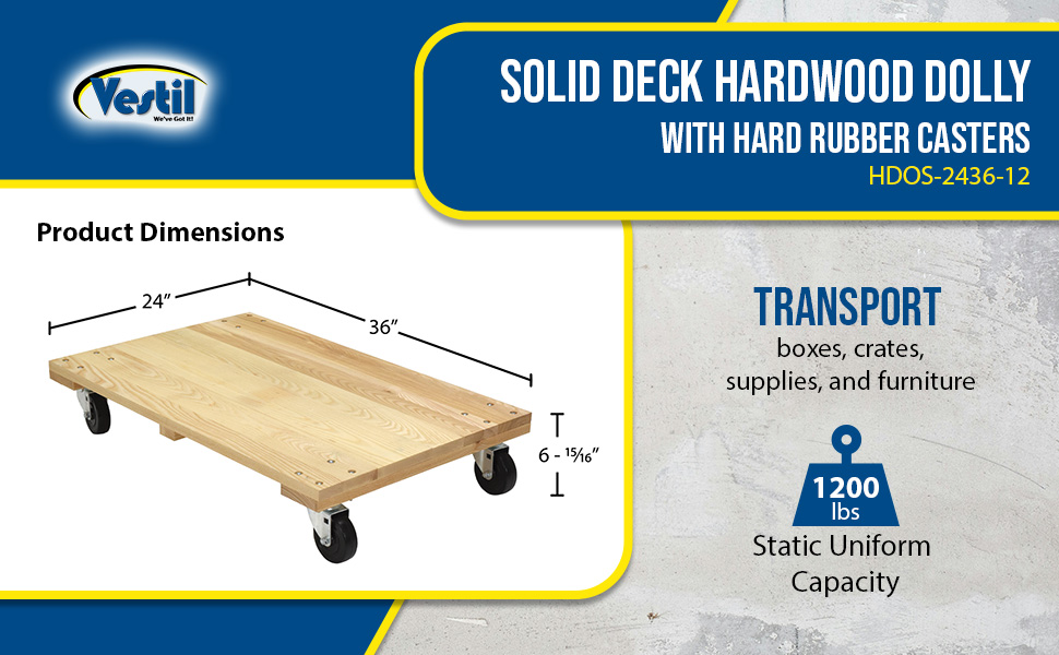 | Hardwood Solid Deck Dolly 36 In. x 24 In. x 6-15/16 In. 1200 Lb. Capacity | Uniform Static Capacity (lb.): 1,200 Deck Width (in.): 24 | 35 |