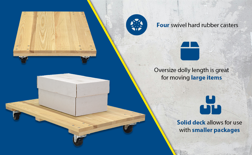 | Hardwood Solid Deck Dolly with Non Marking Casters 36 In. x 24 In. x 6-15/16 In. 1200 Lb. Capacity | Uniform Static Capacity (lb.): 1,200 Deck Width (in.): 24 | 35 |