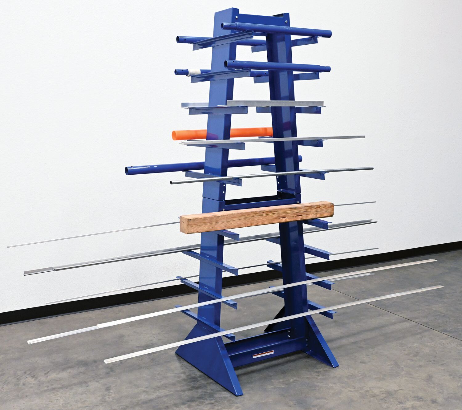 Ideal for use in maintenance departments, tool rooms, machine shops, and storage areas. Arms extend and act as dividers creating bays of storage. Nine arm levels can store material up to 10 feet long. Aligning two units next to each other will allow for the storage of longer material. Arm edges are sloped upward to prevent roll off's. Arms are welded at 6" increments with 6" between levels. Total uniform rack capacity is 2,600 pounds evenly distributed. Unit has predrilled lag down points and ships knocked down. Steel construction with baked-in powder-coated toughness.