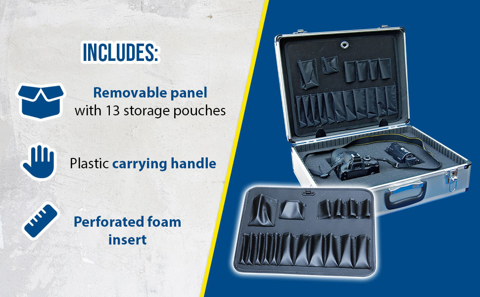 CASE-1814 CASE-1814Aluminum Carrying Case 18 In. x 14 In. SilverStorage Pouches (qty.): 13