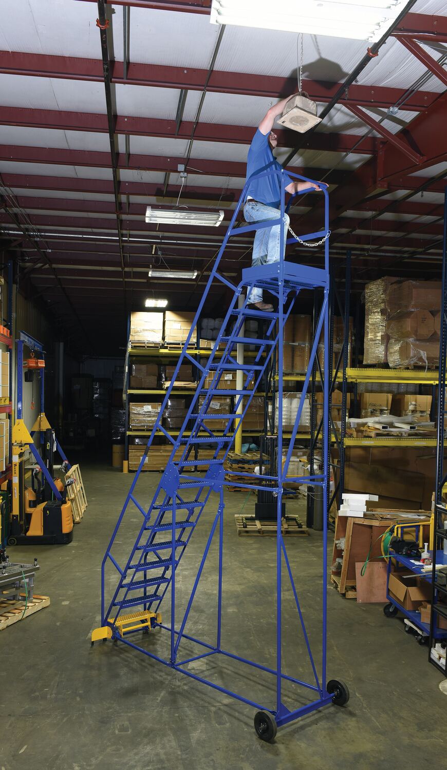 | Steel Rolling Warehouse Ladder 50 Degree 12 Grip Strut 23-9/16 In. Step Width 350 Lb. Capacity Blue | Uniform Capacity (lb.): 350 Number of Steps (qty.): 12 | 416 |
