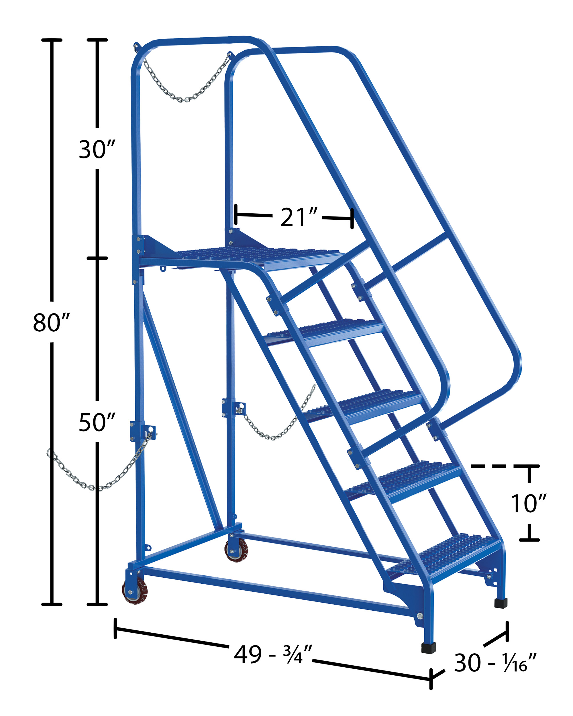 Semi-Trailer Access Ladders are for use getting into Semi-Trailers. Tilt the unit to allow for portability. Units roll on 4" poly-on-poly wheels. Constructed of square tubing framework which handles uniform capacities up to 350 lbs. Features 30" high removable hand railing, access chain, 21" deep top platform, and an industrial baked-in blue powder coat finish for toughness. Each step measures 24" wide by 7" deep and is spaced 10" apart. Climb Angle is 58 degrees. |