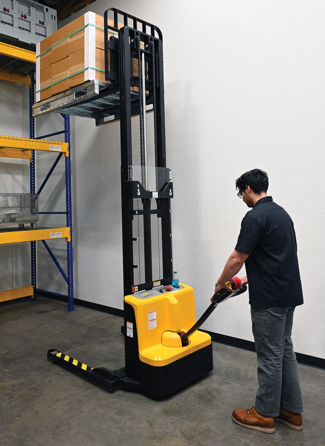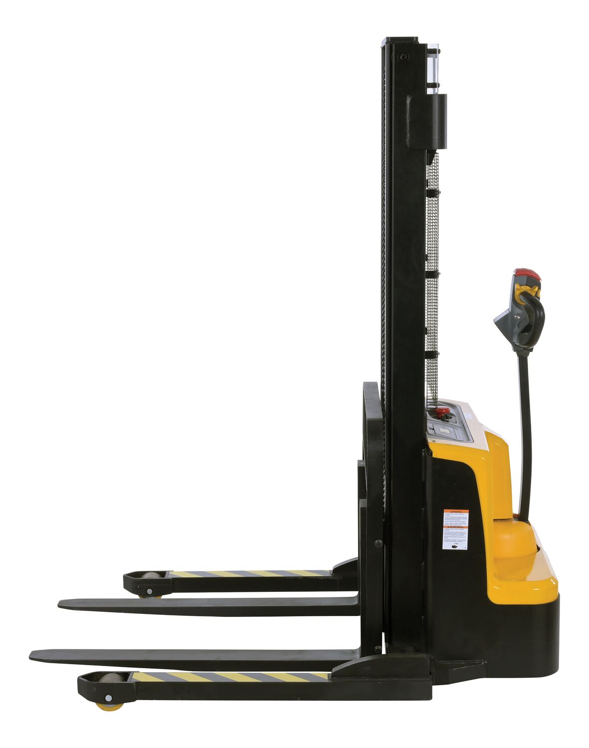 The double mast fully powered electric stacker transports loads throughout warehouse facilities quickly and with less effort. High torque drive and lift motor handles heavy duty jobs. Ergonomic handle features lift/lower controls, proprietary safety enhancing emergency reverse function, and horn. The unit includes an electromagnetic disc brake with automatic dead-man feature. Powered lifter has two 12V lead acid deep cycle batteries, integral battery charger, and a battery level gauge.
