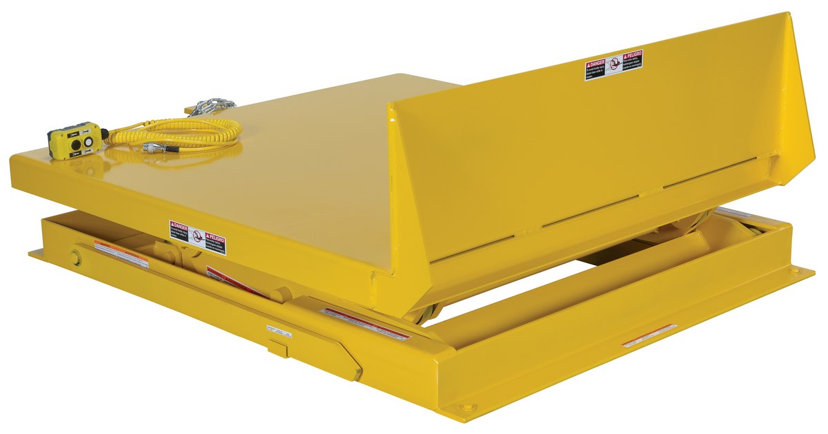 The lift & tilt workstation table allows platform to lift & tilt at the same time for easy operation. Maximum tilt angle is 44 degrees for better ergonomics and operator safety. Service height range is 10" to 24" (to lowest point of platform surface). The platform end includes a high full width lip to support containers. The internal power unit includes electric motor, hydraulic pump, and control box. It includes a two-button hand held pendent control with optional voltages available. The welded steel construction has a yellow painted finish. Foot control available, model FC-2.