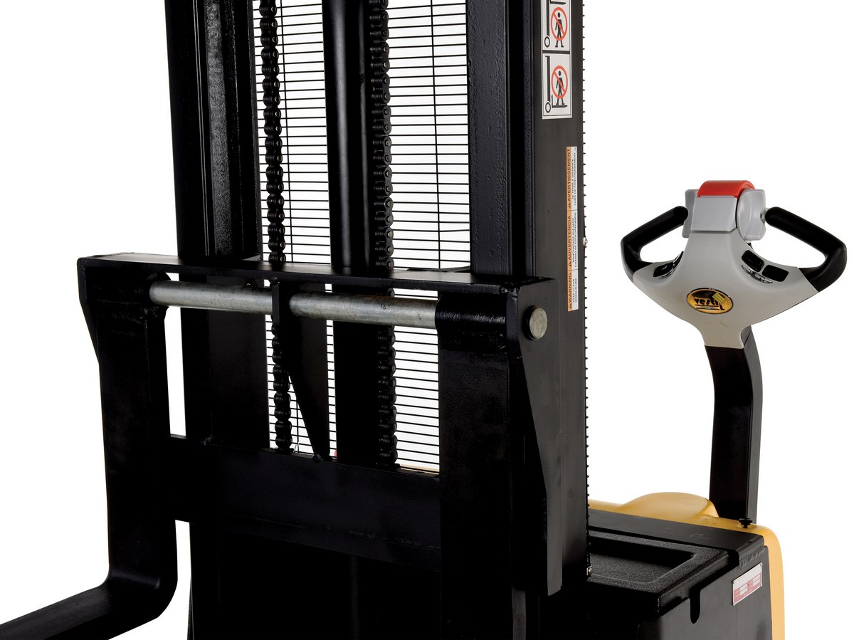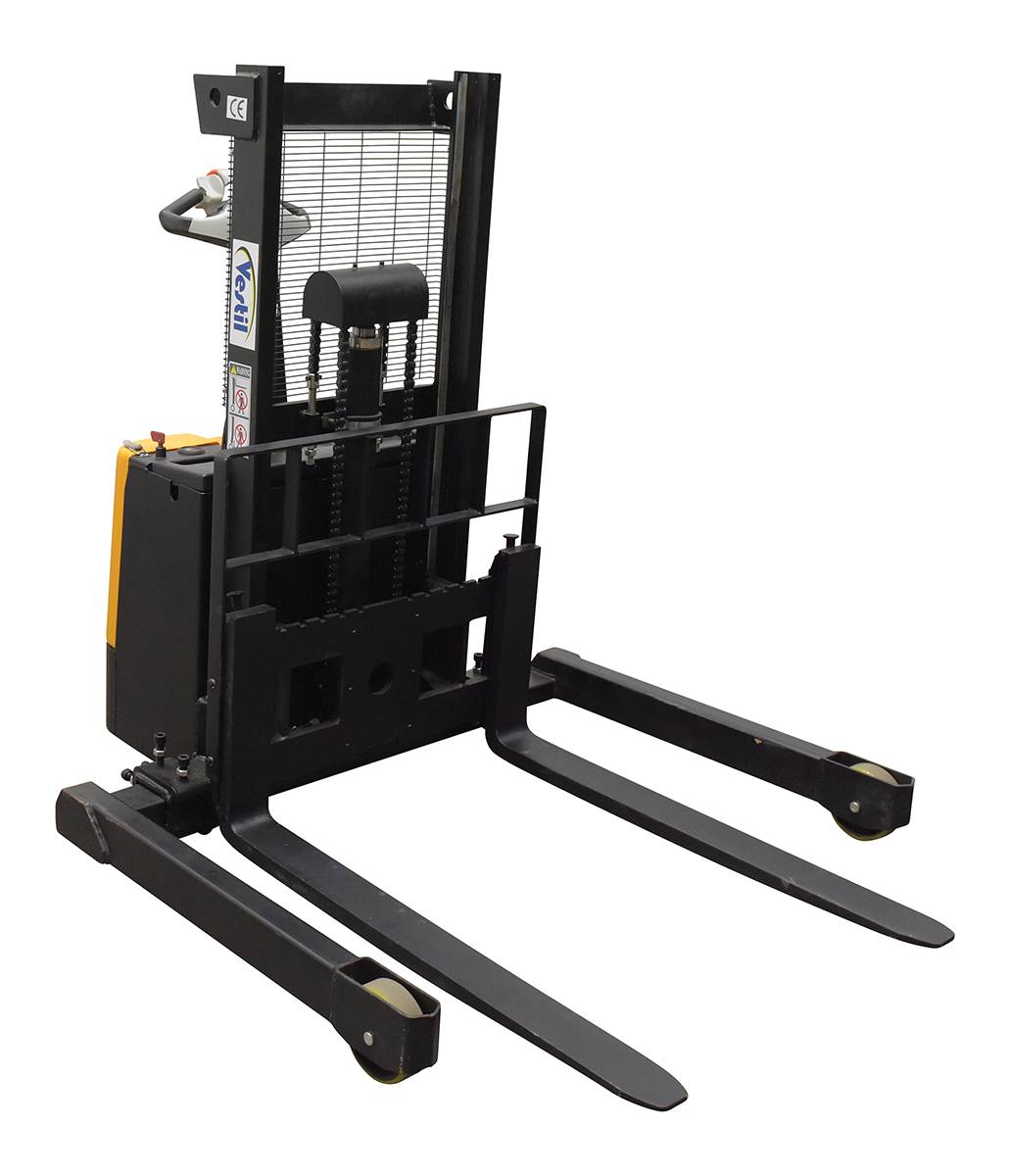 Double Mast Fully Powered Electric Stacker transports loads throughout warehouse facilities quickly and with less effort. High torque 24VDC drive and lift motor handles heavy-duty jobs. Ergonomic handle features easy-to-operate throttle with infinite adjustment of forward and reverse speeds, lift/lower controls, proprietary safety-enhancing emergency reverse function, and horn. Includes an electromagnetic disc brake with automatic dead-man feature that activates when user releases the handle. Powered lifter has two 12V lead acid deep cycle batteries, integral battery charger, and battery level gauge. Stacker rolls smoothly on poly-on-steel steer and load wheels. Feature 1.0 KW drive and 2.0 KW lift motor. 3-4 hour operation at full charge - 8 hours when used intermittently.