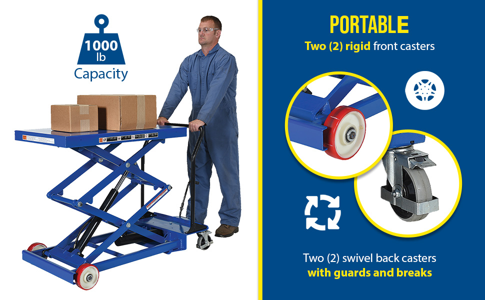 Constructed of heavy duty steel and designed to withstand the most demanding industrial environments. Ideal for lifting and transporting loads, order-picking, die handling, and for use in support of assembly operations. Little exertion is required to raise and lower the deck with the high quality, foot-actuated, single-speed hydraulic pump. The hydraulic system is equipped with an overload protection valve. The hand operated carts have safety stops to prevent an empty deck from lowering while performing maintenance. The foot operated carts have a unique tilt-up table top that allows for safe and easy maintenance. Two (2) rigid front casters and two (2) rear swivel polyurethane casters with brake provide a high degree of maneuverability; each swivel wheel is protected by guards and is equipped with brakes.