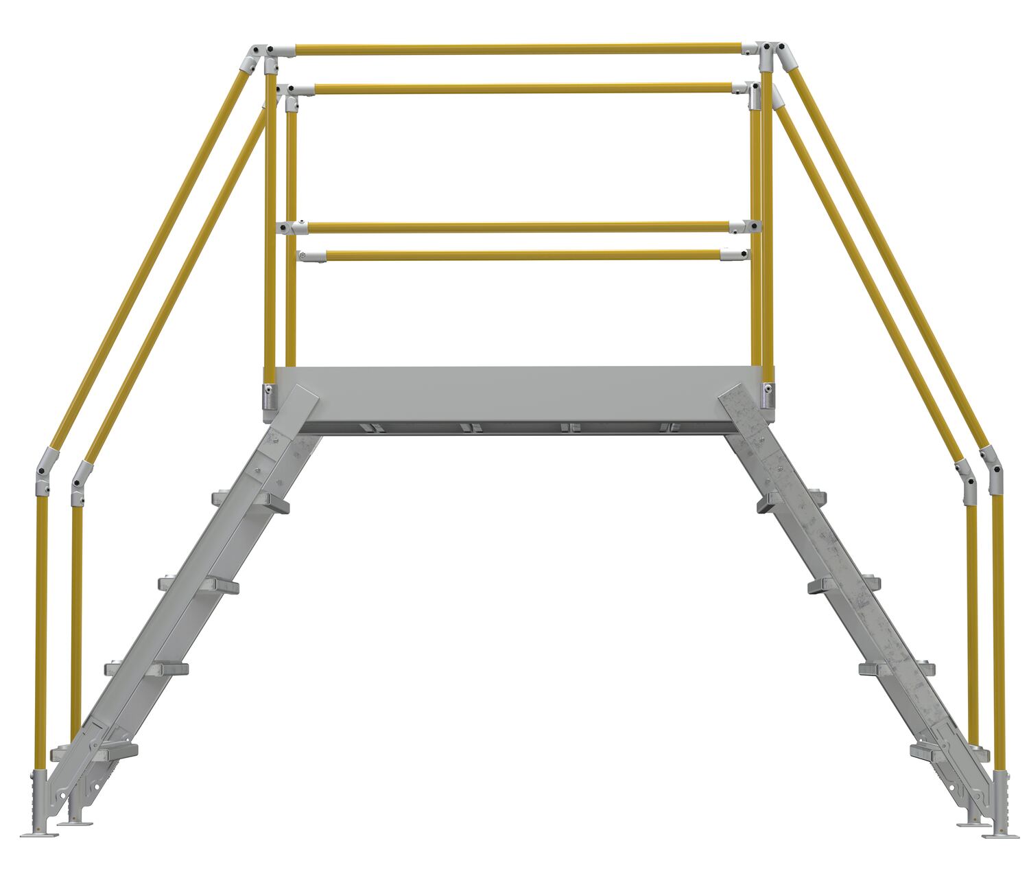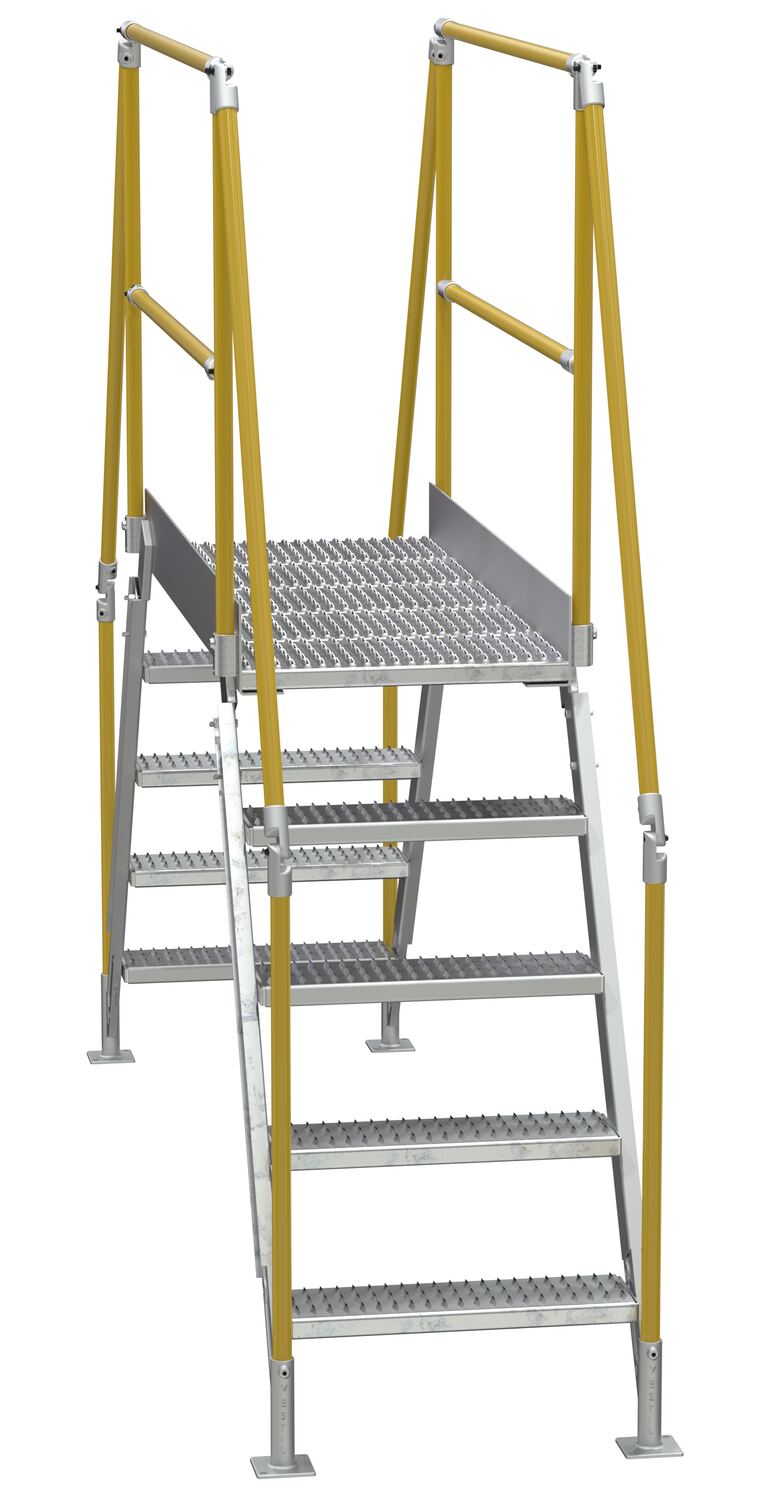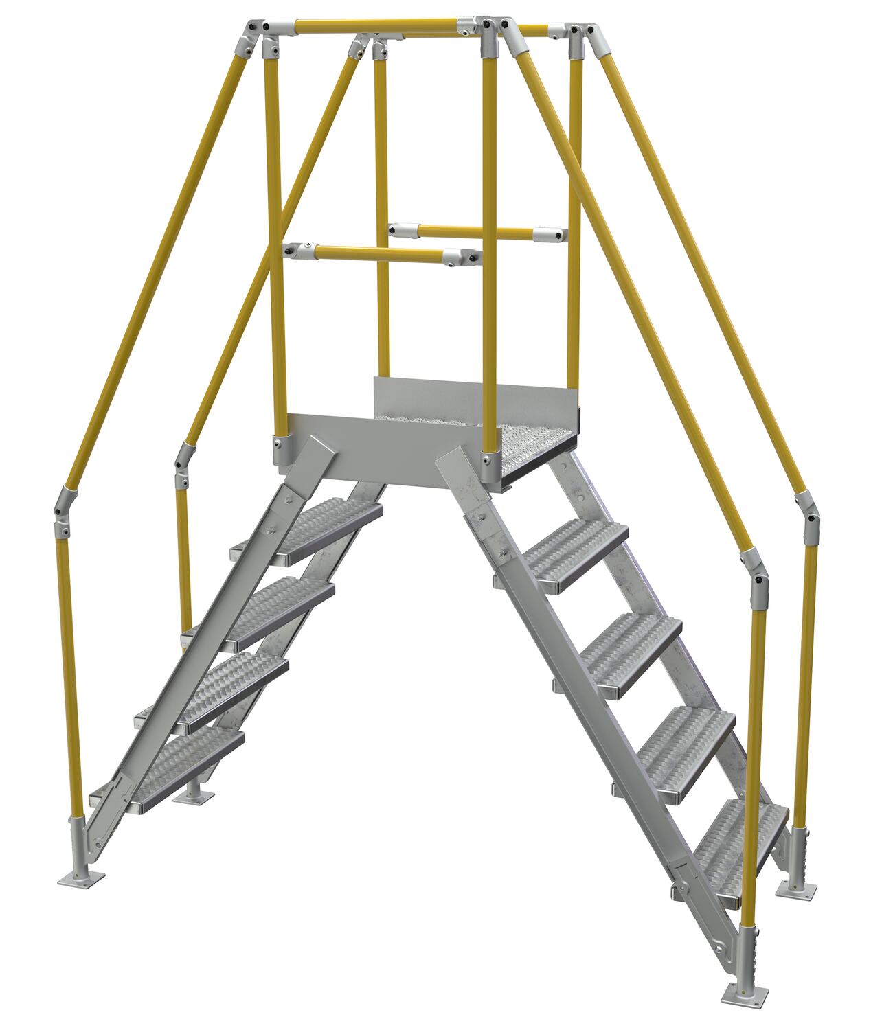 In industrial settings, every inch of floor space matters. With the installation of a cross over ladder, all floor space is able to be utilized fully. An aluminum construction and simple mounting, the ladder can be placed in a permanent location to best fit the floor layout. Serrated steps give the user sure footing going up and down the ladder, while the handrails give added security. Mid and top rails give balance and safety support to users while on the upper platform. Hardware is included. Handrail is powder coated yellow for increased visibility.