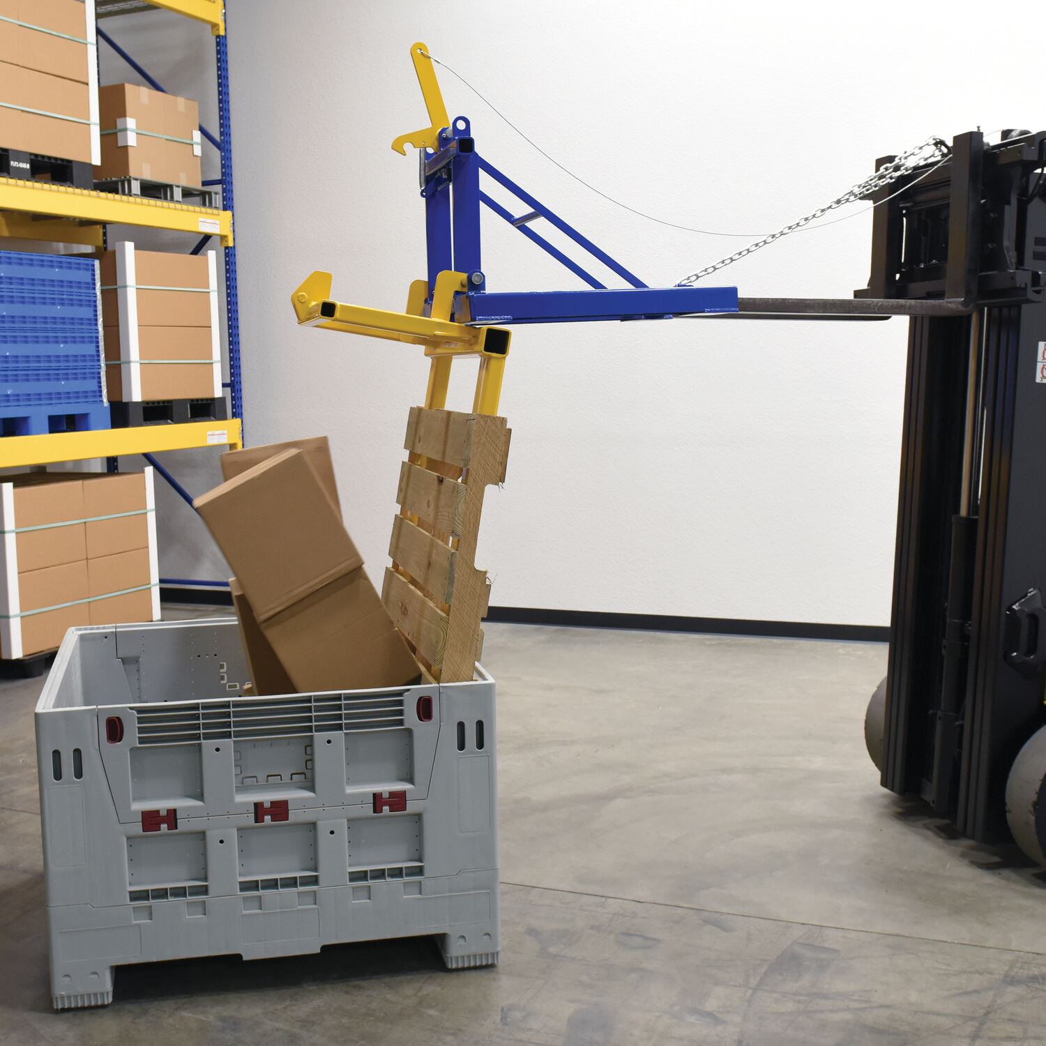 • Pallet tilts and dumps the load into a hopper or dumpster
