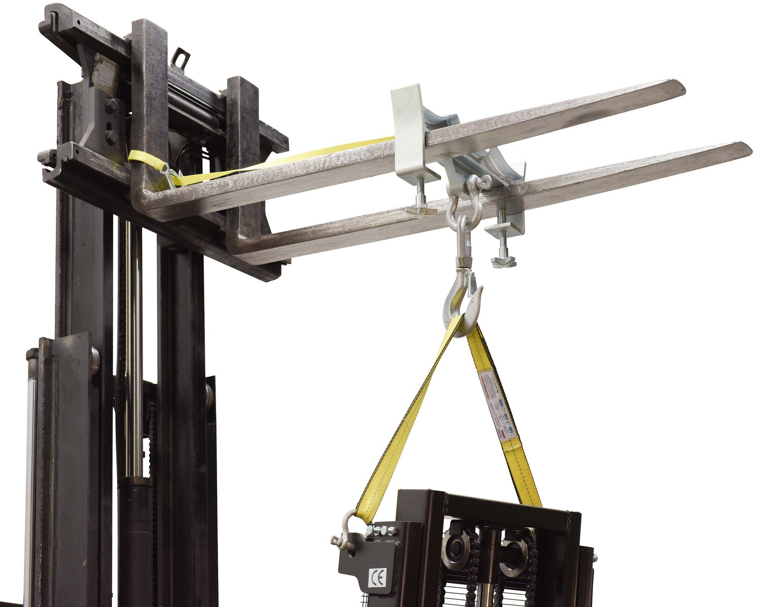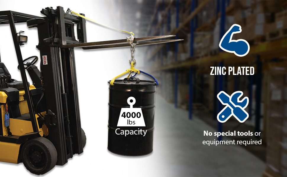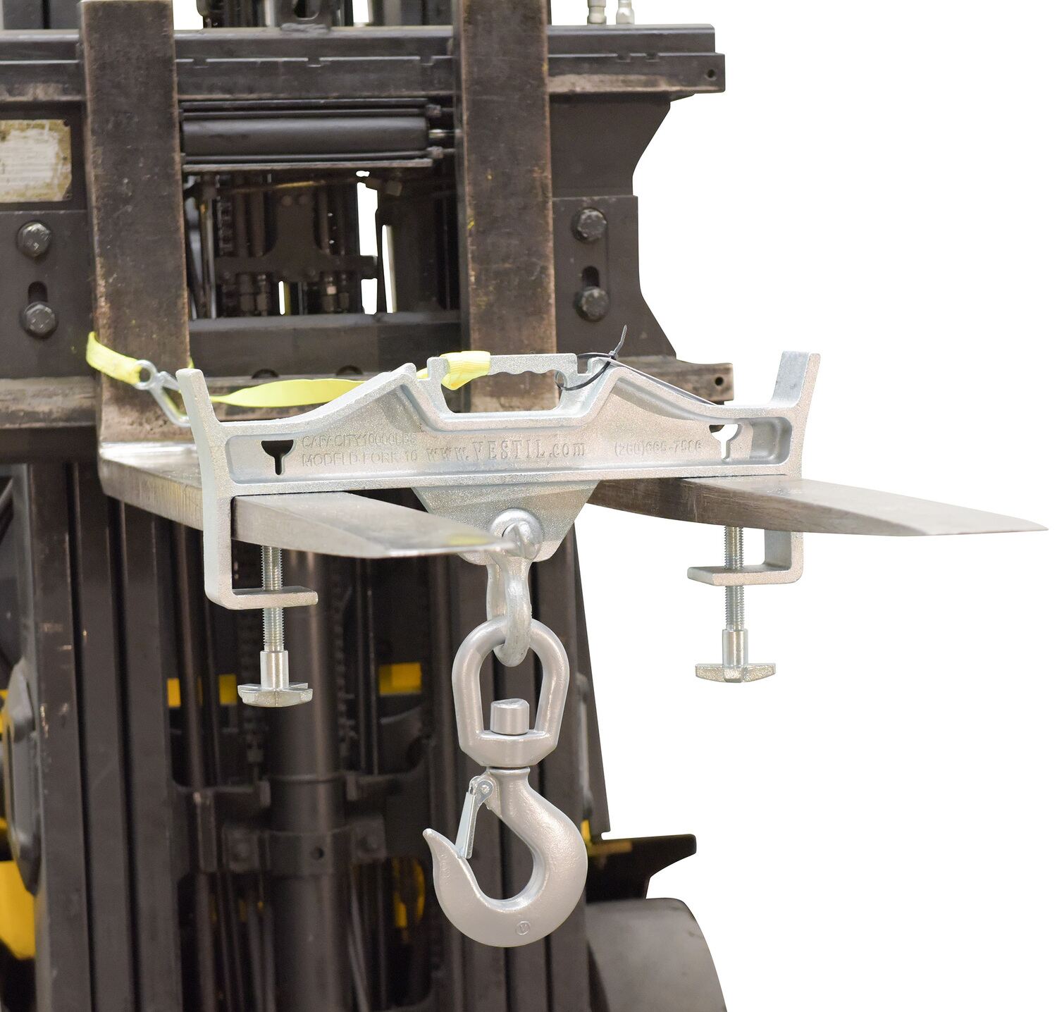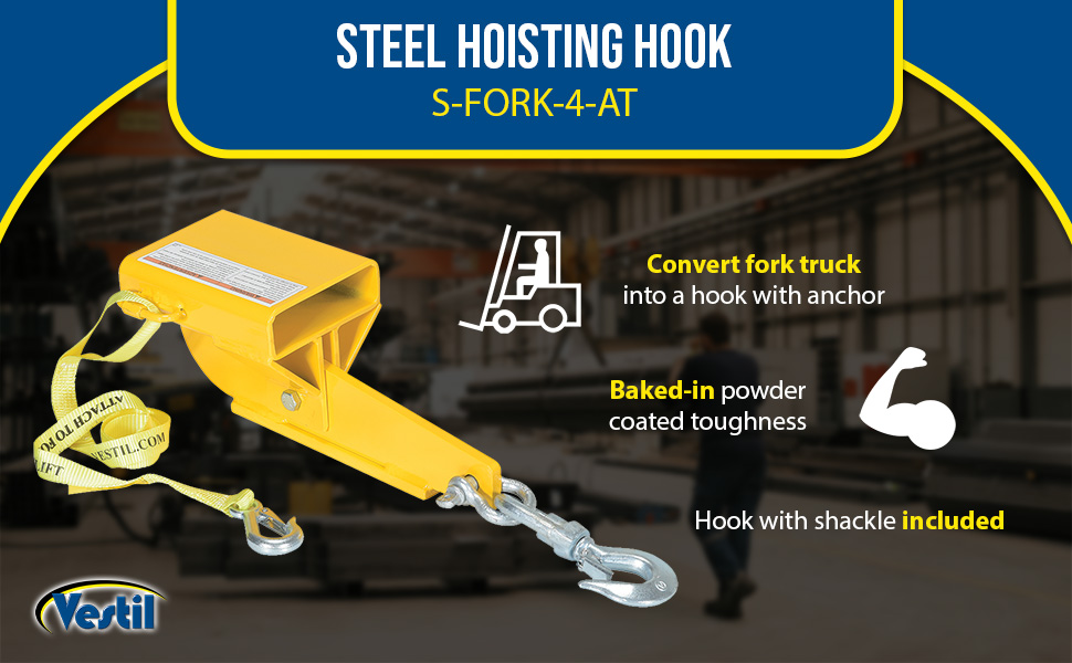 Convert your fork truck into a hook with anchor in a matter of seconds. The easy to attach Hoisting Hook does not require the assistance of special tools. Secured to the fork truck by means of a 48" long safety restraint and screw clamps. Available in single or double fork design. Units are zinc plated. Hook with shackle included. Model S-FORK-4-AT, Auto-Tension Hoisting Hook, offers a unique design and adds tension as weight is added, this unit has a yellow baked-in powder-coated toughness.