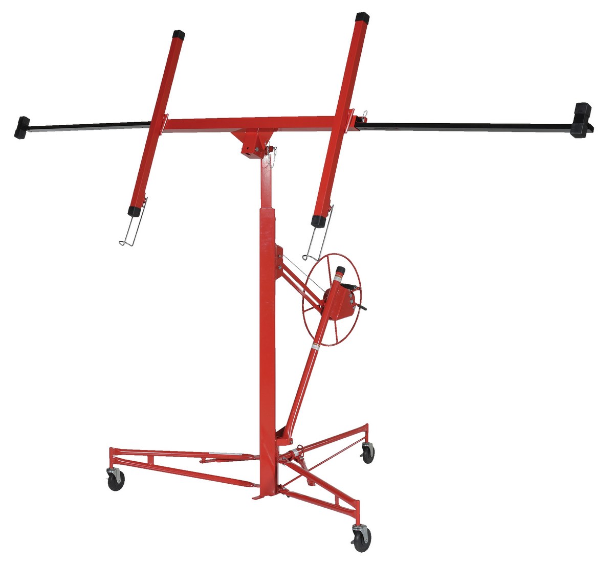 This deluxe drywall - panel hoist lifts panels for installation on ceilings or walls up to eleven (11) feet high. Synchronized telescoping mast action for fast, and smooth raising/lowering action. Easy winch operation, with a built-in brake mechanism to reduce fall hazards. This hoist is affordable but very dependable with all welded steel and heavy duty construction. Dismantles to fit in the trunk of most cars. 360 degree swivel cradle to load sheets or panels vertically or horizontally.
