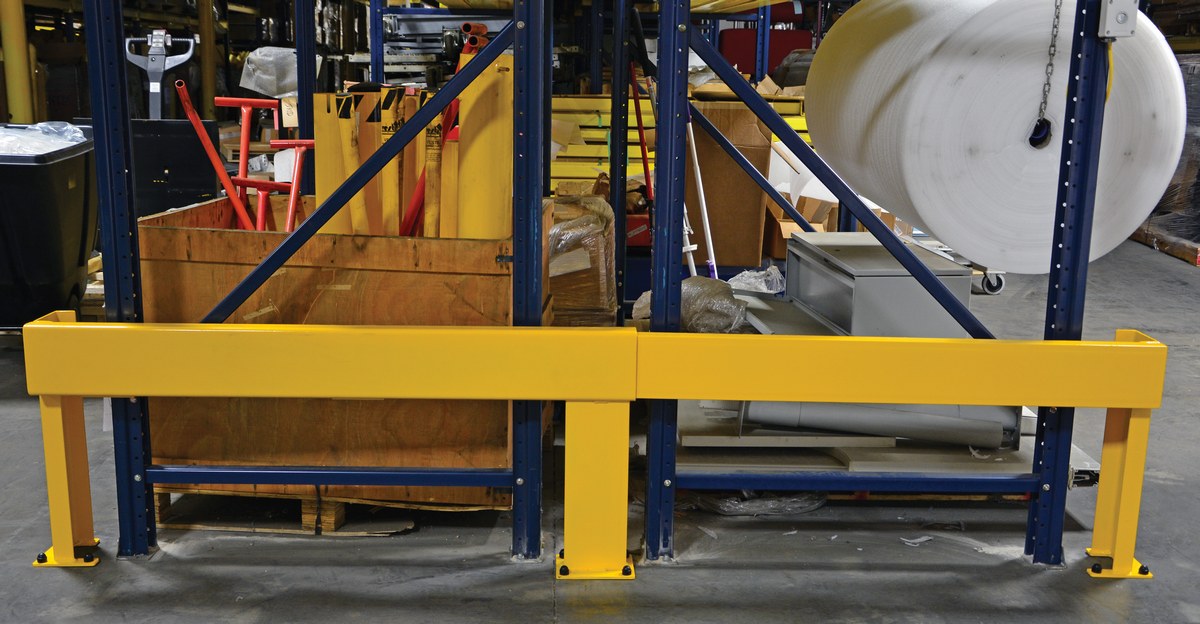 Protect the row ends of tandem pallet racking with this heavy-duty, welded steel adjustable rack guard. Slide in design has a variable length range of 62" to 108". Includes steel mounting plates with (10) 7/8" diameter holes to safely secure unit to floor. Powder coated with safety yellow finish.