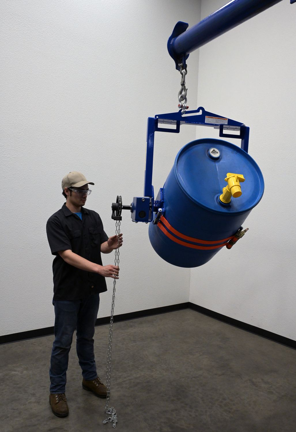 Rotate and position a fully loaded 55 gallon steel drum with ease. Use with an overhead hoist or a fork truck. Fork pockets measure 5-1/2"W x 1-15/16"H usable. Features a chain crank that allows the operator to rotate 360 degrees drums that are out of reach. Drums are held in place with a drum locking system. Meets OSHA 1910.179 requirements. Model DCT-2000 features gear box operation. Models ending with suffix "4WFP" have bolt on fork pockets for 4 way entry, usable 5"W x 1-9/16"H and 5-1/2"W x 1-15/16"H. |