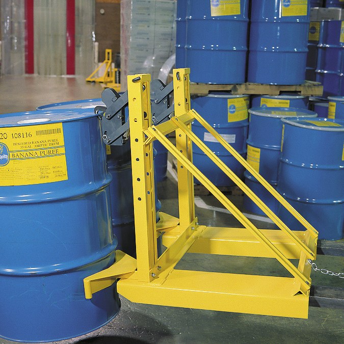 Fork truck attachments utilize a light duty single automatic clamping mechanism for handling any size steel or plastic chimed drum. Model FMDL-850 is a knockdown unit that bolts together. Fork pockets and safety chain provide quick and easy installation. Model FMDDL-1700 is fork mounted, with fork pockets and safety chain. The following are fork mounted drum lifters that enable fork truck operators to install or remove the attachment in seconds without any tools. Totally enclosed fork pockets with attached safety chain and cam lock secures the attachment to the fork truck. Models FMDL-1500 & FMDDL-3000 - Fork truck attachments utilize a heavy duty single automatic clamping mechanism for handling steel, fiber and plastic chimed drums in high volume applications. Models FMDL-2000 & FMDDL-4000 feature heavy-duty double articulating clamping mechanisms for handling any steel, plastic or fiber chimed drums in high volume applications. Each drum is gripped with two upper and lower jaws in heads that are spaced about 6 inches apart. |