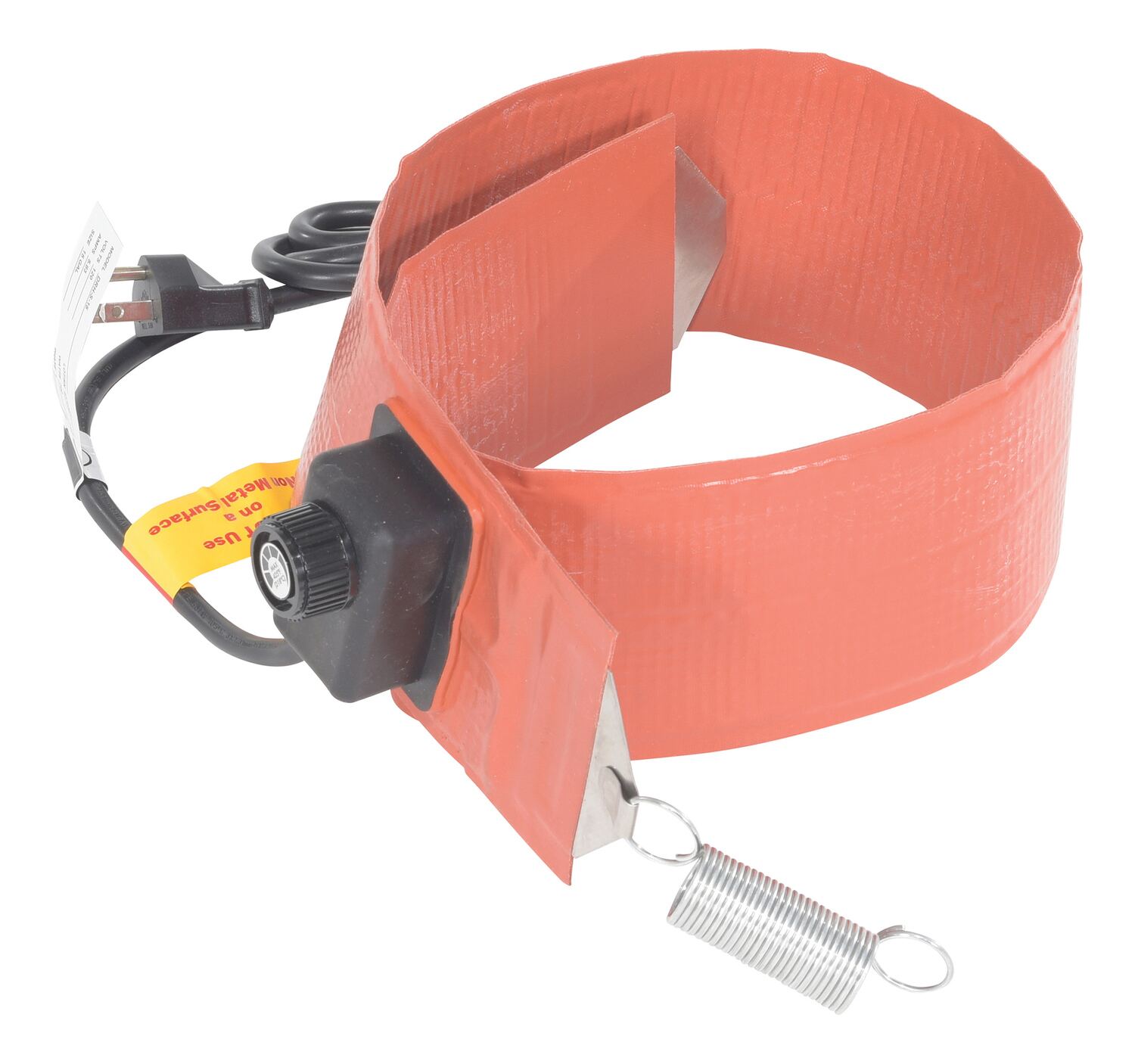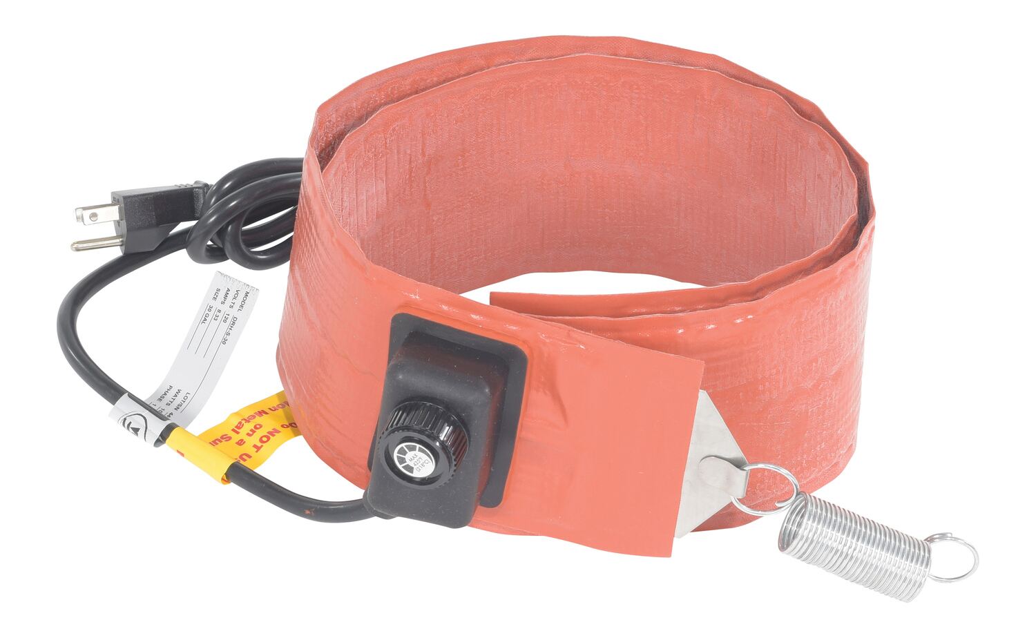 Quickly and efficiently heat-up your steel drums or pails. Easily adjust thermostat set-point: 50 to 425 degrees Fahenheit for steel drums and 50 to 160 degrees Fahrenheit on poly drums. This extra-wide 4" silicone rubber band heater is moisture and chemical resistant. Multi-stranded grounded heating element provides uniform heat and a long service life. Spring closure can be expanded 3". Unit comes with a 6-foot-long power cord, grounded 3-prong. The -CA suffix indicates models that are CSA approved for use in Canada only. Feature a 6 foot long power cord with no plug. The use of multiple heaters may reduce heat stratification of the material being heated.