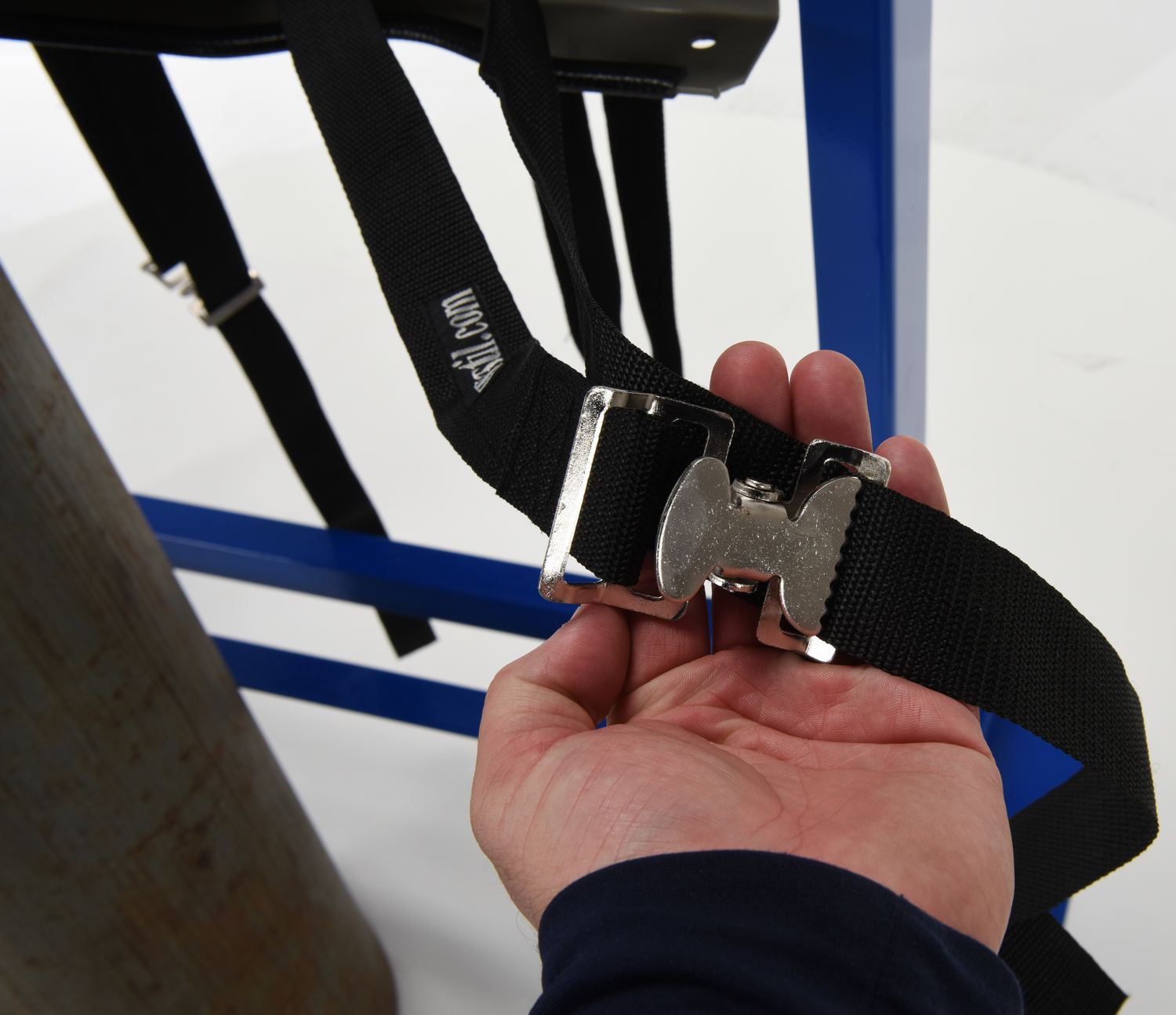 Our Cylinder Bracket Stands allow for storage of cylinders in the vertical position. The straps are included for securing the cylinders to the stand. The CB-ST models have pre-drilled mounting holes for attachment to the floor (floor mounting hardware is not included). Stands are powder-coated blue and steel brackets feature a gray painted finish. Assembly hardware included.