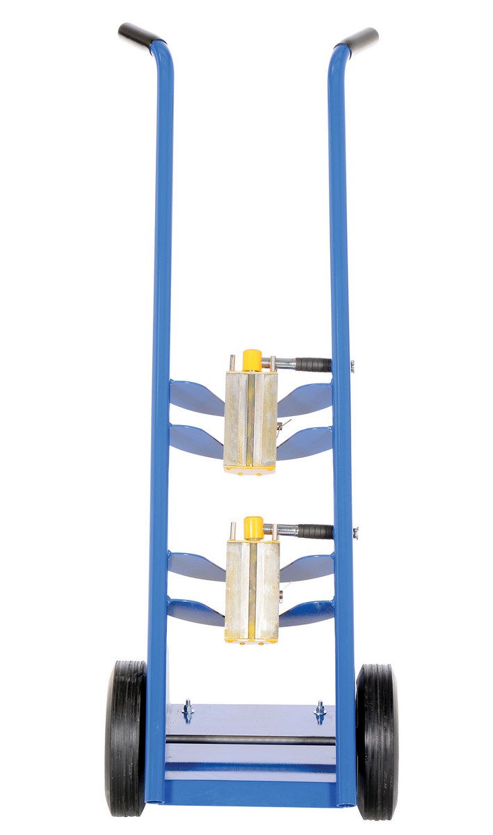 Designed and built to transport gas cylinders with ease, this hand truck uses strong magnets to hold the tanks in place. Units rolls easily on two (2) 10" x 2-1/2" rubber tires and two (2) 3" x 1-1/4" swivel casters. The tilt back design allows for effortless transportation. Baked-in powder-coated toughness.