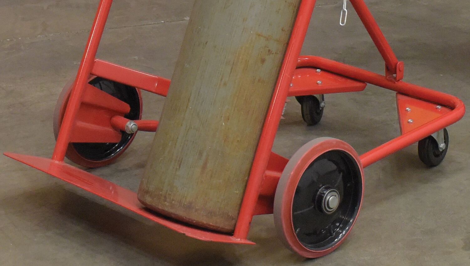 Ideal for transporting cylinders from storage to work space. Tilt back design for effortless transportation. Chains and contoured back cradle provide utmost safety. The two mounted chains measure 28" long. Unit rolls smoothly on two (2) 10" x 2" mold-on-rubber wheels and two (2) 4" x 1-3/8" phenolic casters.