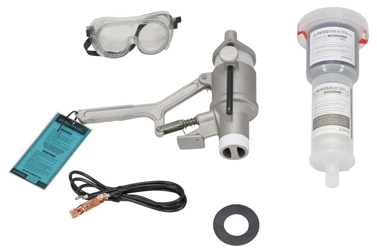 Turn aerosol cans into scrap metal, exempting them from disposal regulations for hazardous waste. This system safely punctures aerosol cans to relieve pressure, and then empties any residual contents into your drum. Thread the recycler body into the 2" diameter threaded bung and the filter into the 3/4" bung of your 30 or 55 gallon steel or poly drum. Push the lever to puncture the can, and two piece filter with a carbon cartridge drains out odors and harmful emissions. Unit includes puncturing device, safety goggles, carbon filter, and Anti-Static wire, which prevents static buildup by grounding the drum as required by OSHA.