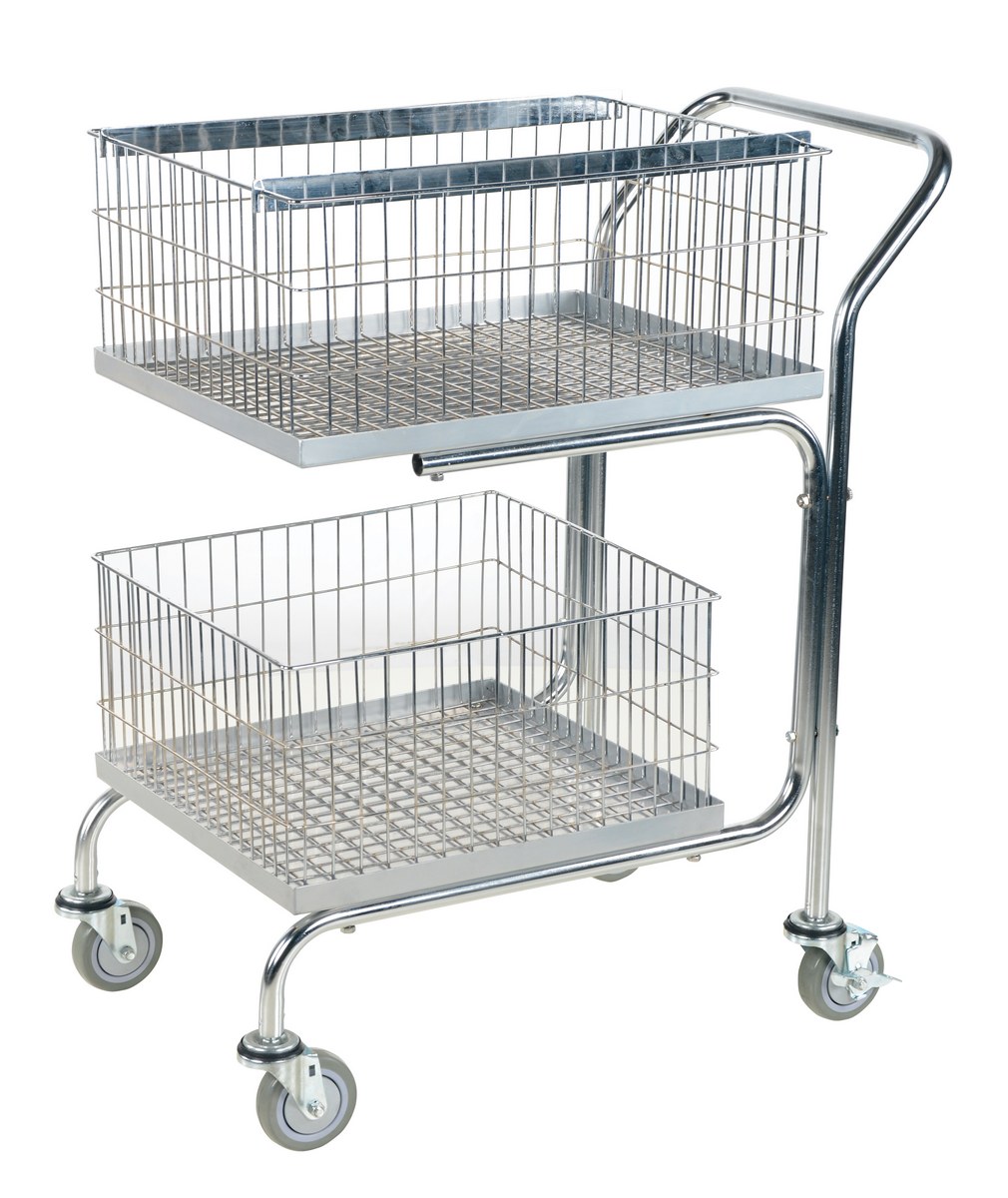 Quickly transport office mail and small package delivery throughout your office and warehouse. Two removable, lift-out baskets make delivery, collection and filing of materials easy and convenient. Comes with two file folder hanger runners that can be adjusted for letter or legal size hanging files. Excellent mobility on (4) 4" x 1-1/4" swivel casters with rear brakes. Uniform static capacity is 200 pounds. Steel construction. Easy assembly.