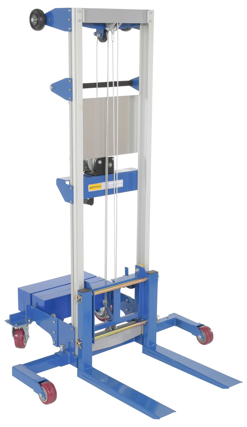 Aluminum/Steel Manual Hand Winch Lift Truck With Counter Balance 500 Lb. Capacity Silver/BlueThe hand winch lift truck is compact and designed to lift material to and from shelves, move office equipment, and install ceiling/wall appliances. It's constructed of durable steel-and-aluminum and a counterbalance design (counterweight included). Operated by a hand-crank winch that features a reversible handle and hold-down device for securing the carriage during transport. The non-adjustable forks can be inverted to provide different height ranges.