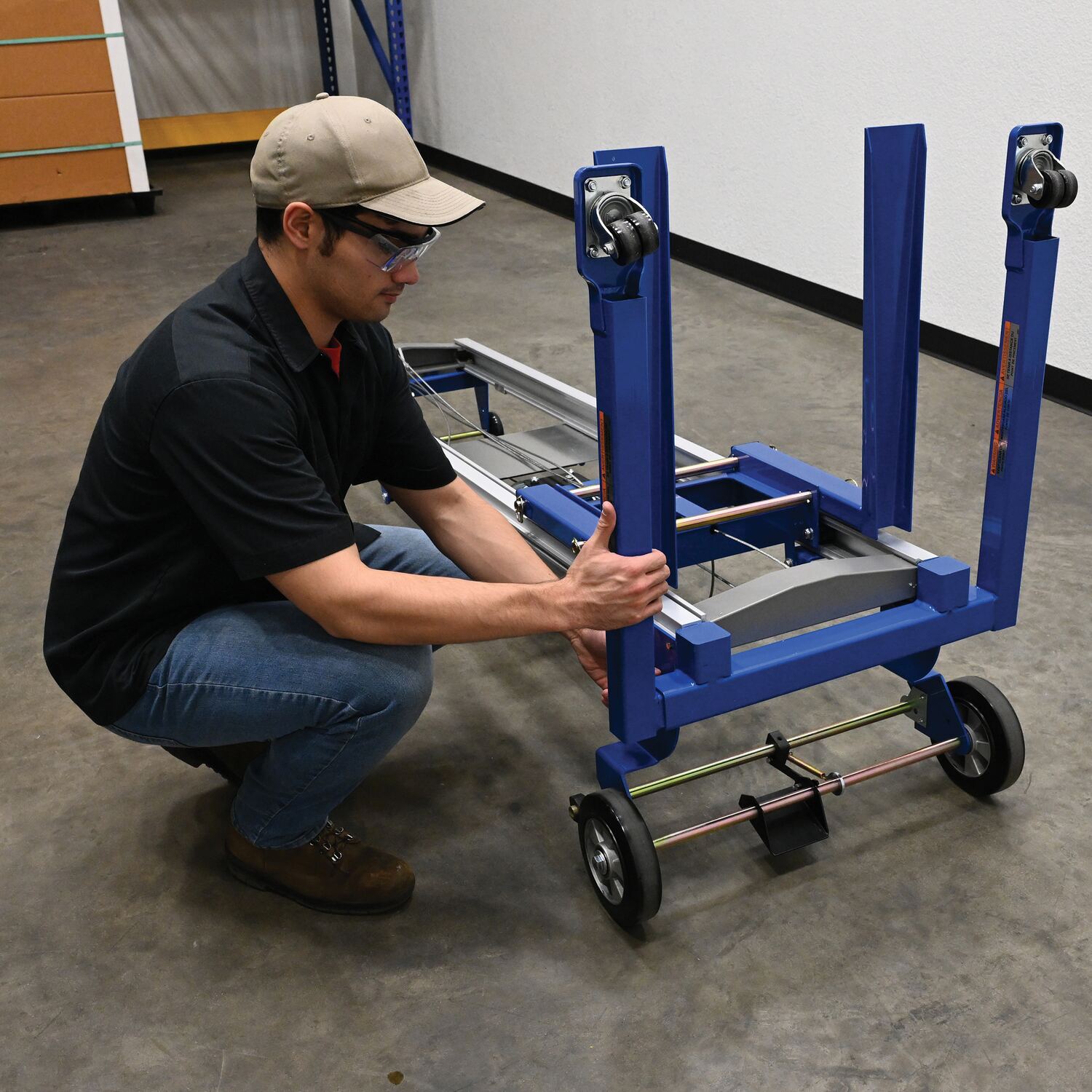 Aluminum/Steel Adjustable Straddle Manual Hand Winch Lift Trucks 350 Lb. Capacity Silver/BlueThe hand winch lift truck is compact and designed to lift material to and from shelves, move office equipment, and install ceiling/wall appliances. It's constructed of durable steel-and-aluminum. Operated by a hand-crank winch that features a reversible handle and hold-down device for securing the carriage during transport.