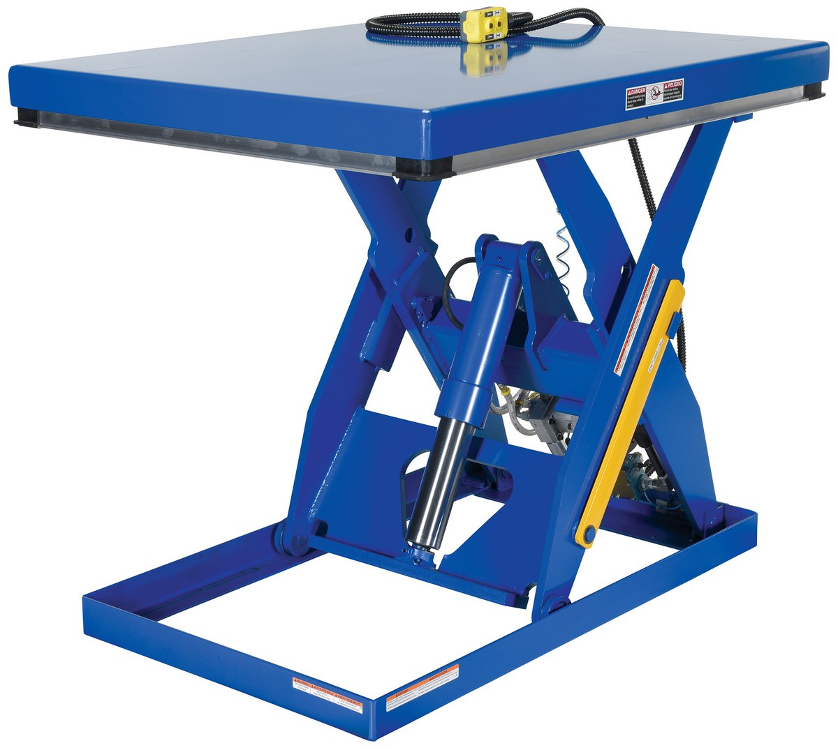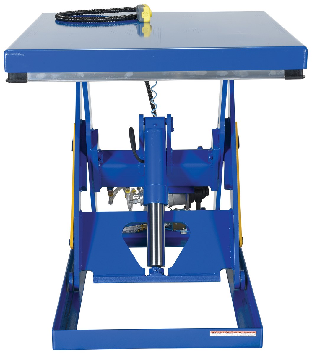 Steel Rotary Air Hydraulic Scissor Lift Table 40 In. x 48 In. 3,000 Lb. Capacity BlueThe rotary air/Hydraulic scissor lift table utilizes the convenience of factory air to power the lift table. Simply connect to an air supply through a filter, regulator, lubricator, and you will have a lift table suitable for a wide range of applications and operating environments. It features a pneumatic upper travel limit switch, safety toe guards, cylinder with internal safety velocity fuse, two button hand control, and life-time lubricated sleeve bearings.