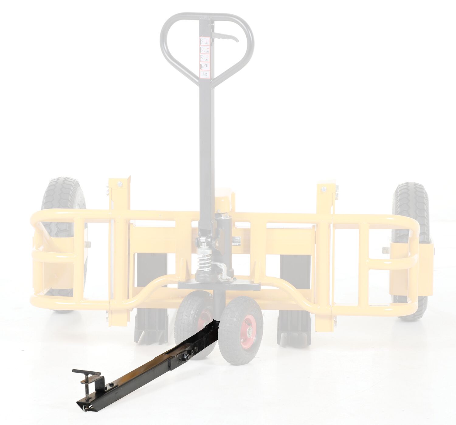 Optional tow bar Package allows the all terrain pallet truck to be towed by an ATV or small utility tractor. It's designed for pulling in either loaded or unloaded position. For storage purposes, a yellow nylon pulling strap is included.