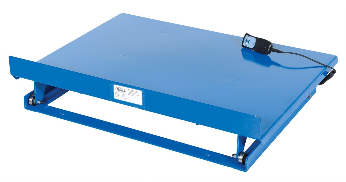 Linear Bench Top Tilter 28 In. x 36 In. 500 Lb. Capacity BlueThe heavy-duty bench top tilter easily attaches to most industrial table tops, work benches, and mobile lift tables of sufficient load capacity and surface size. The unit slides back as it tilts to maintain the center of gravity over the frame. Manual units can be adjusted only when unloaded and the linear actuated units are equipped with a push-button hand pendant control. The flat base plate has slotted holes for installation.