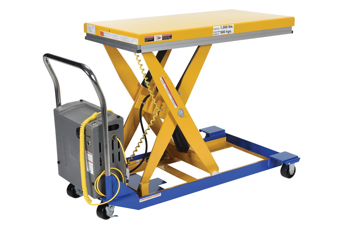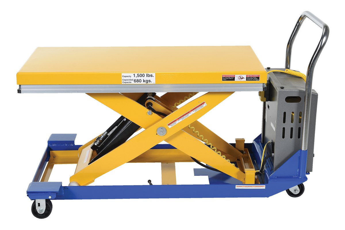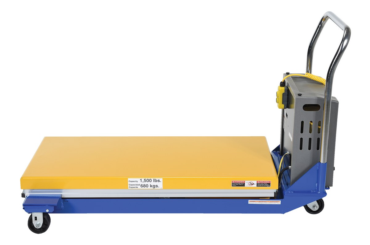 Steel DC Powered Scissor Cart 48 In. x 24 In. 1500 Lb. Capacity Blue / YellowThe DC powered Scissor Cart table provides an unparalleled support in lifting, palletizing, loading, and unloading applications. The cart is raised or lowered with a DC powered motor. The unit rolls smoothly on two rigid and two swivel phenolic casters with brakes. The internal DC powered electric motor and battery is included on DC units. The built-in battery charger is AC powered and is included. Push buttons to raise and lower lift are located on a hand control with a coil cord, which is standard. The platform is equipped with perimeter pinch-point guard for OSHA compliance. The push handle is removable. Features an internal safety velocity fuse in each cylinder.
