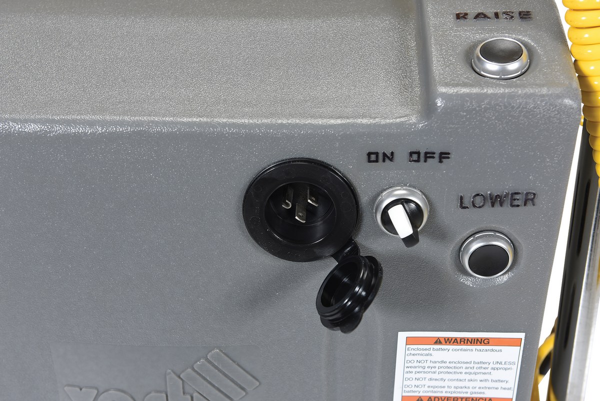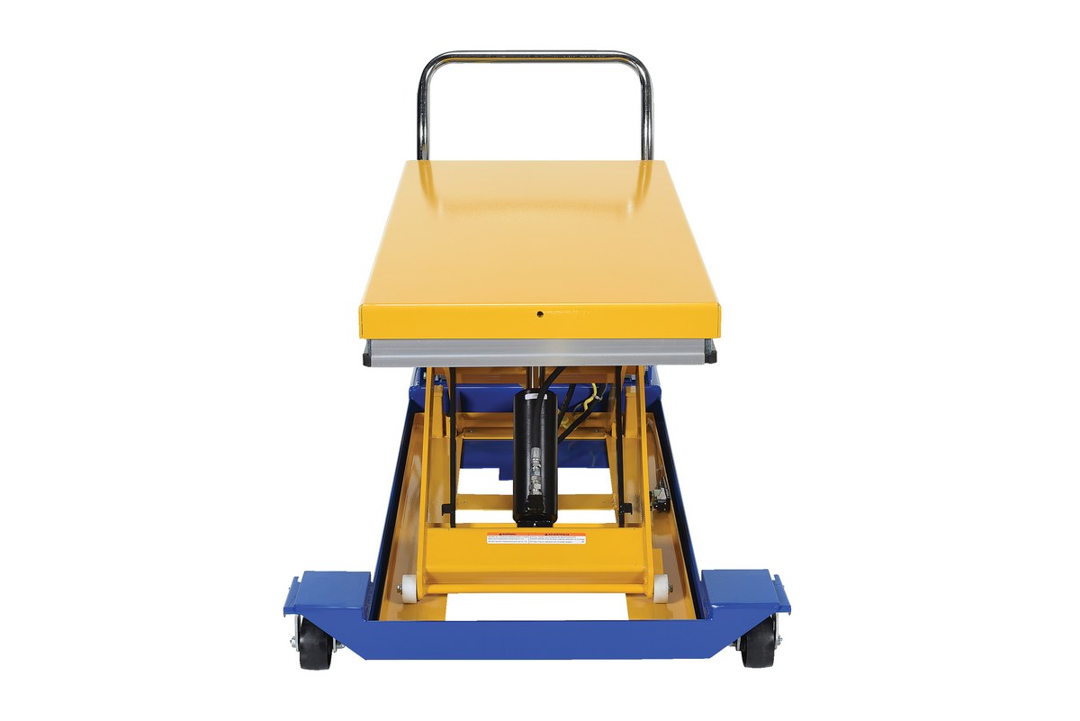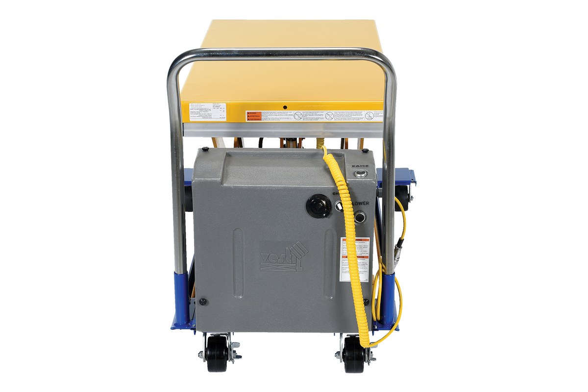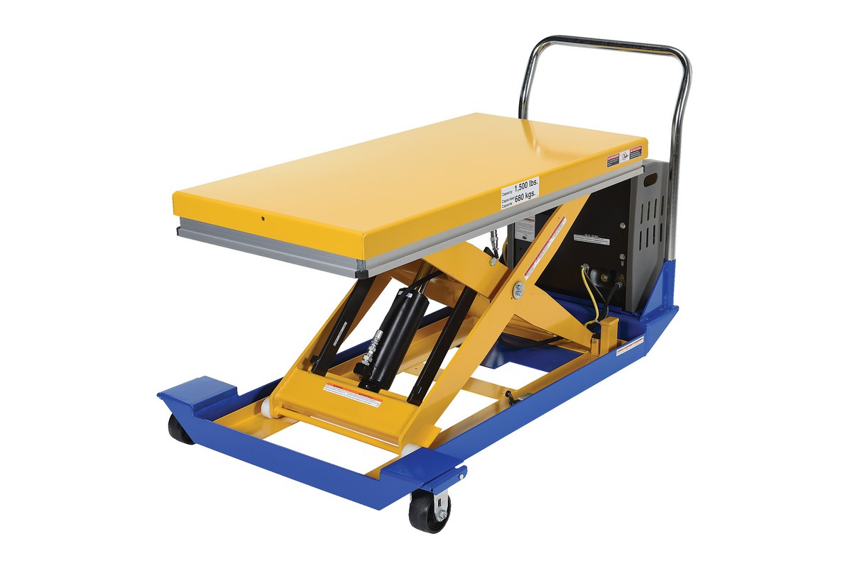 Steel DC Powered Scissor Cart 48 In. x 24 In. 1500 Lb. Capacity Blue / YellowThe DC powered Scissor Cart table provides an unparalleled support in lifting, palletizing, loading, and unloading applications. The cart is raised or lowered with a DC powered motor. The unit rolls smoothly on two rigid and two swivel phenolic casters with brakes. The internal DC powered electric motor and battery is included on DC units. The built-in battery charger is AC powered and is included. Push buttons to raise and lower lift are located on a hand control with a coil cord, which is standard. The platform is equipped with perimeter pinch-point guard for OSHA compliance. The push handle is removable. Features an internal safety velocity fuse in each cylinder.
