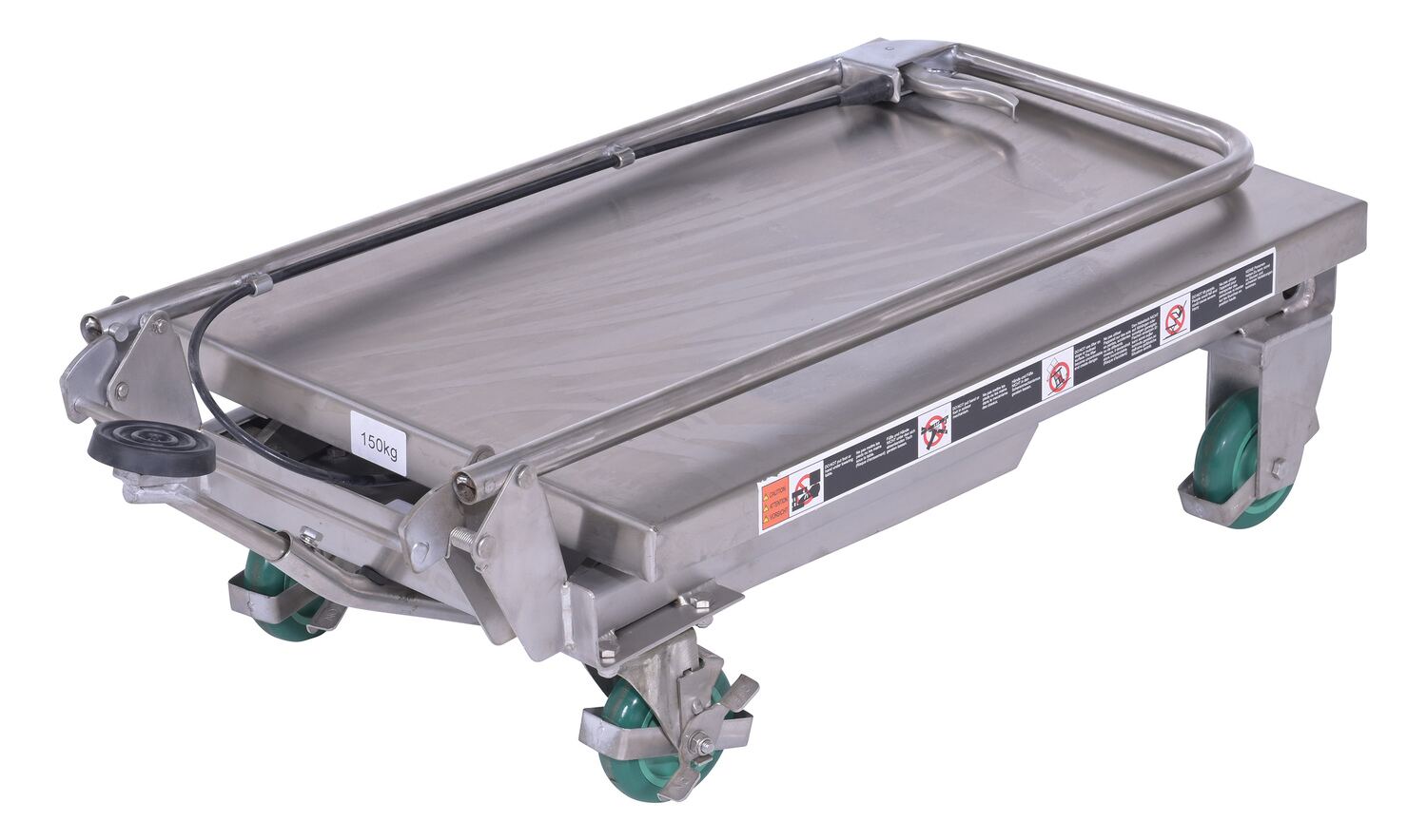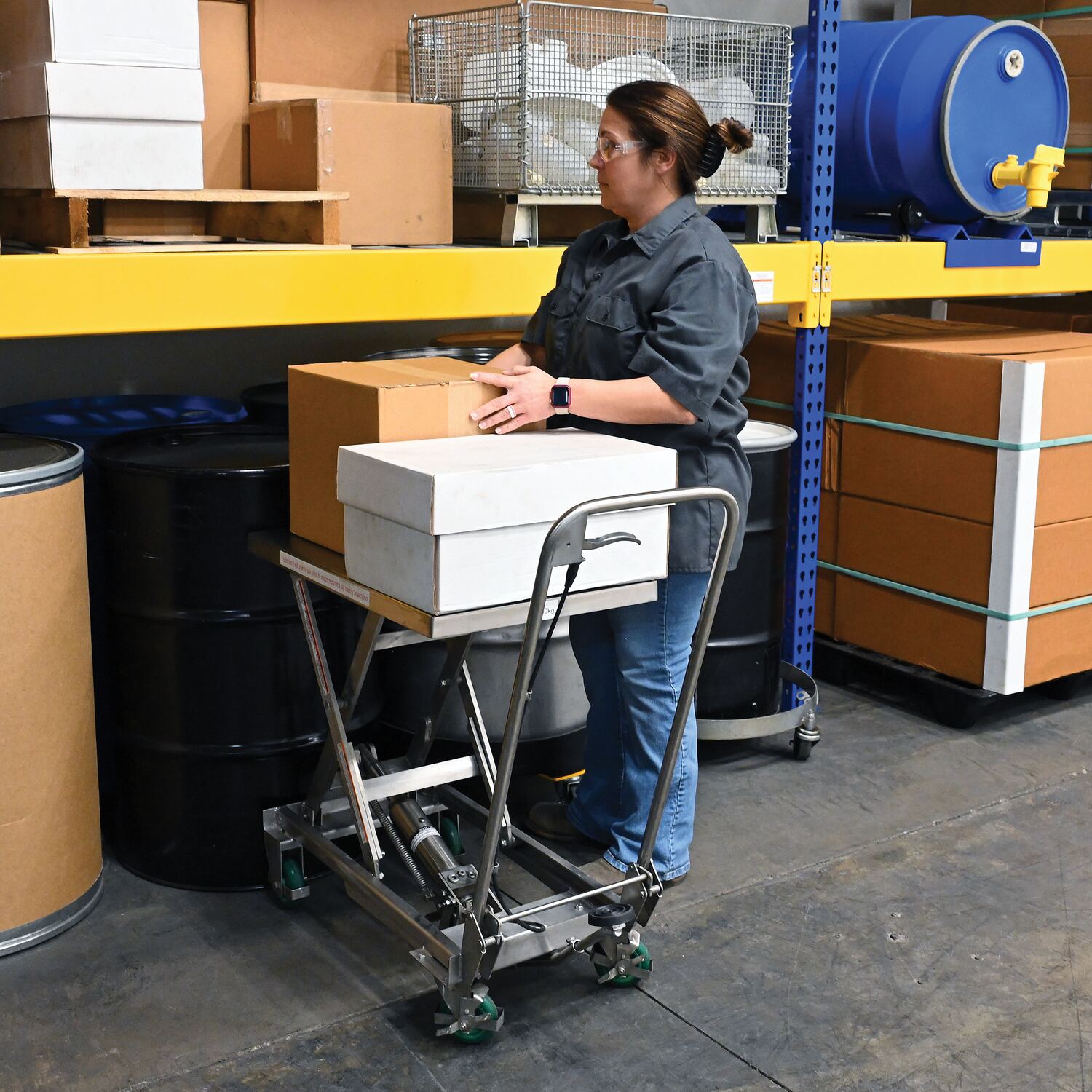 Stainless Steel Scissor Cart 17-3/4 In. x 27-5/8 In. 300 Lb. Capacity SilverOur fully welded Stainless Steel carts are suitable for most food, medical and pharmaceutical industry settings. They are also suitable for wash-down applications. The quick manual raising and lowering lets the user adjust the height to their desired preference. While an open platform design makes for simple loading and unloading from all sides. Capacity is rated for 300 lbs.