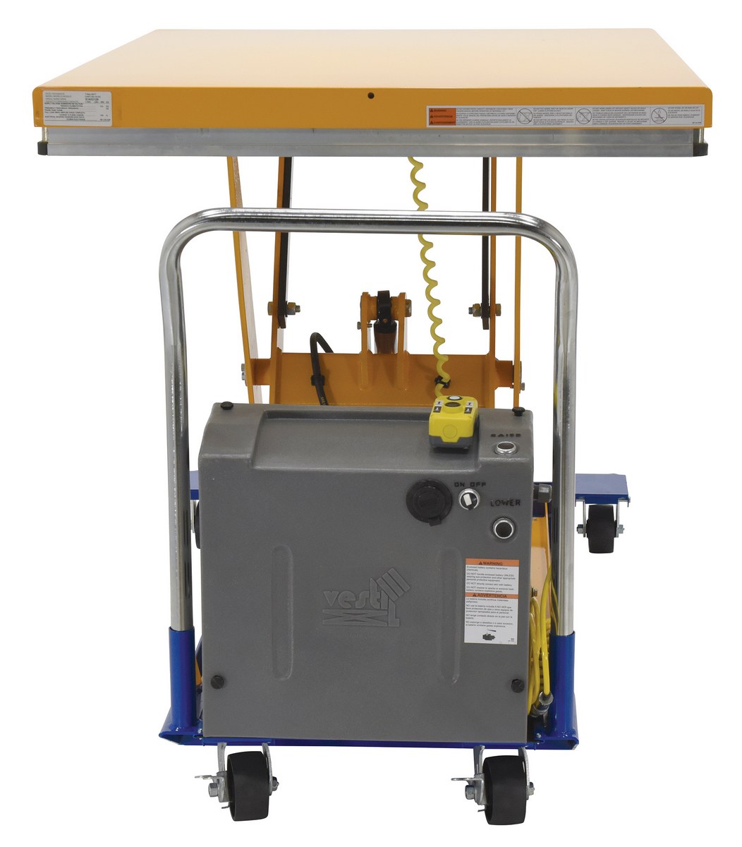 Steel DC Powered Scissor Cart 48 In. x 40 In. 1500 Lb. Capacity Blue / YellowThe DC powered Scissor Cart table provides an unparalleled support in lifting, palletizing, loading, and unloading applications. The cart is raised or lowered with a DC powered motor. The unit rolls smoothly on two rigid and two swivel phenolic casters with brakes. The internal DC powered electric motor and battery is included on DC units. The built-in battery charger is AC powered and is included. Push buttons to raise and lower lift are located on a hand control with a coil cord, which is standard. The platform is equipped with perimeter pinch-point guard for OSHA compliance. The push handle is removable. Features an internal safety velocity fuse in each cylinder.