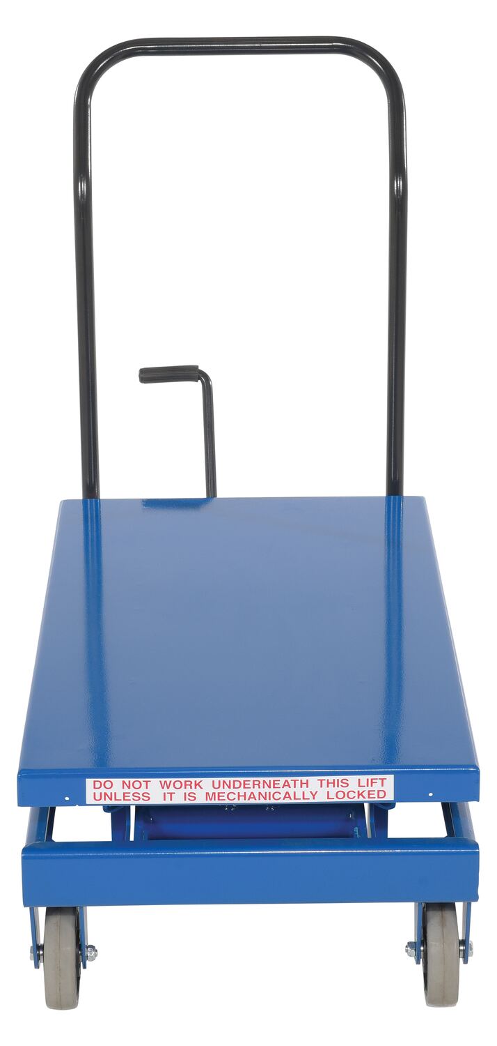 Steel Heavy Duty Premium Scissor Cart 19 In. x 33 In. 600 Lb. Capacity BlueThe premium scissor lift cart is constructed of heavy duty steel and designed to withstand the most demanding industrial environments. The simplicity and compactness of these products make them ideal for lifting and transporting loads, order-picking, die handling, and for use in support of assembly operations. There is little exertion required to raise and lower the deck due to the high quality foot-actuated, single speed hydraulic pump. The hydraulic system is equipped with an overload protection valve. Each cart has safety stops to prevent an empty deck from lowering while performing maintenance. A unique tilt-up table top allows for safe and easy maintenance. The two rigid front casters and two rear swivel polyurethane casters with brake provide a high degree of maneuverability; each swivel wheel is protected by guards and is equipped with brakes. Features an internal safety velocity fuse in each cylinder.