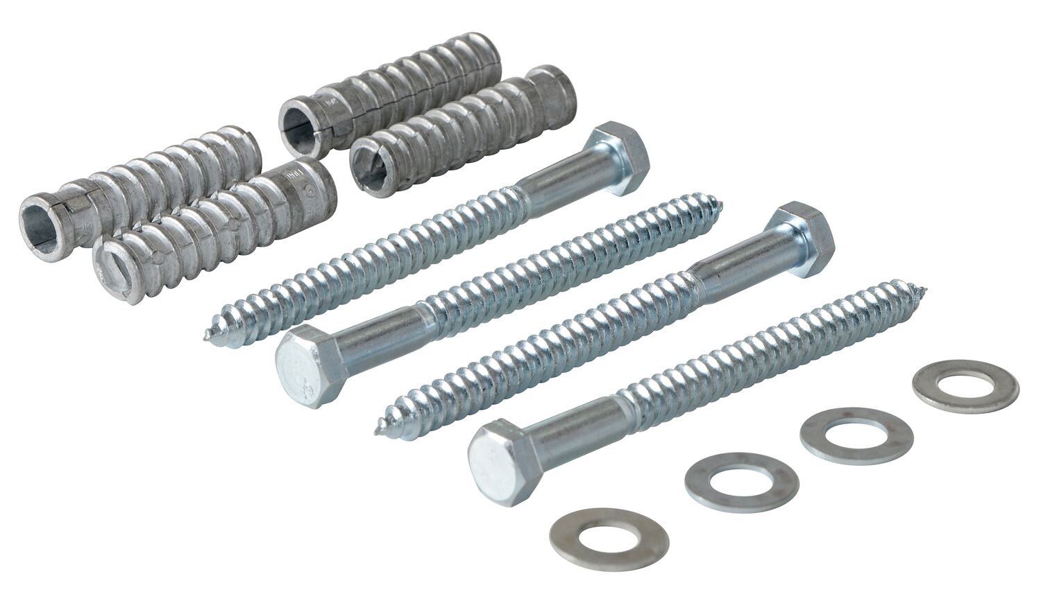Steel Q195 Concrete Car Stop Hardware Kit 4 Pack SilverThe hardware package provides a simple solution to mounting car stops to a concrete surface. The package includes bolts, anchors, and washers for safe, secure attachment.